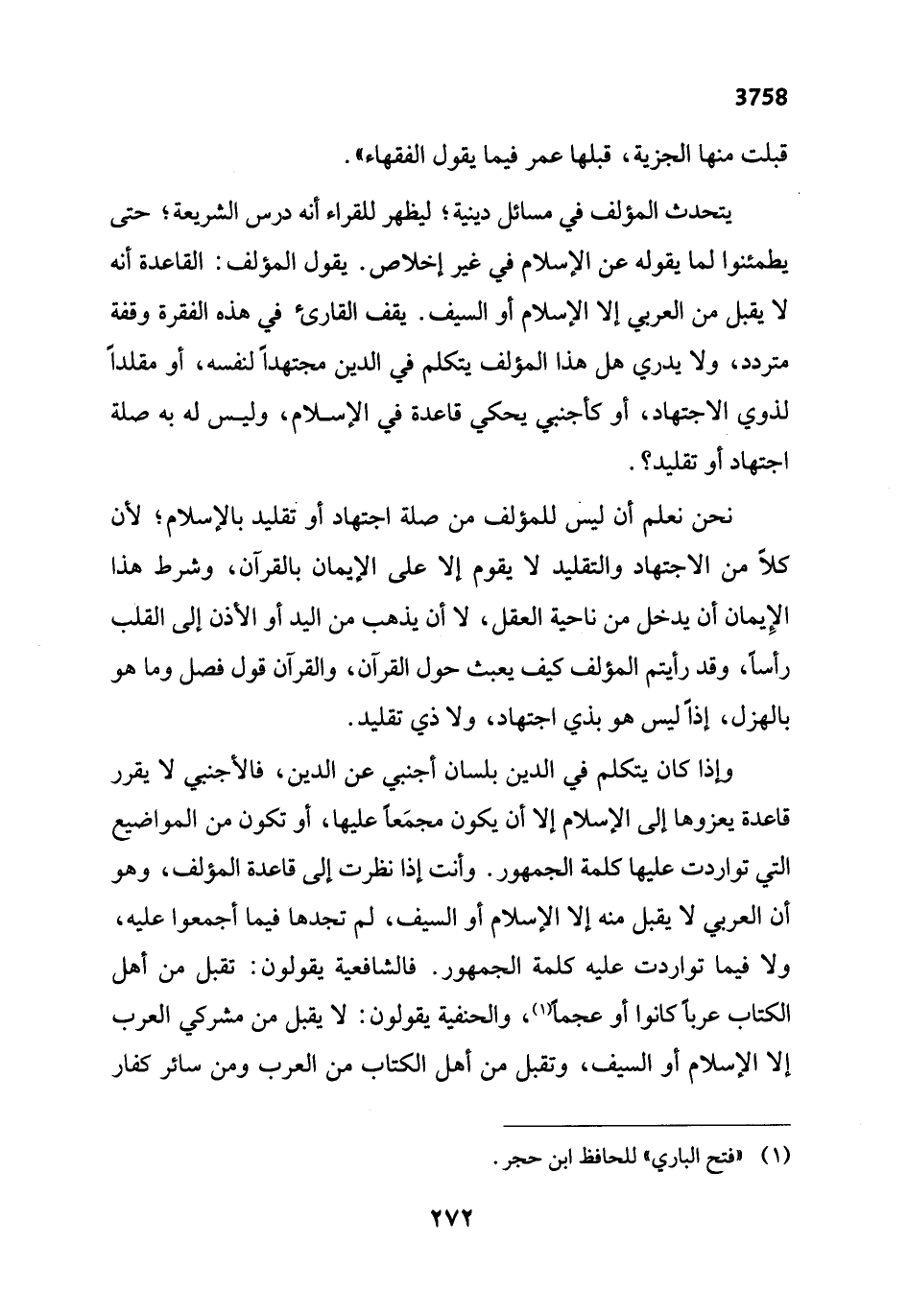 وإذا كان يتكلم في الدين بلسان أجنبي عن الدين، فالأجنبي لا يقرر قاعدة يعزوها إلى الإِسلام إلا أن يكون مجمَعاً عليها، أو تكون من المواضيع التي تواردت عليها كلمة الجمهور. وأنت إذا نظرت إلى قاعدة المؤلف، وهو أن العربي لا يقبل منه إلا الإِسلام أو السيف، لم تجدها فيما أجمعوا عليه، ولا فيما تواردت عليه كلمة الجمهور. فالشافعية يقولون: تقبل من أهل الكتاب عرباً كانوا أو عجمًا (¬1)، والحنفية يقولون: لا يقبل من مشركي العرب إلا الإِسلام أو السيف، وتقبل من أهل الكتاب من العرب ومن سائر كفار