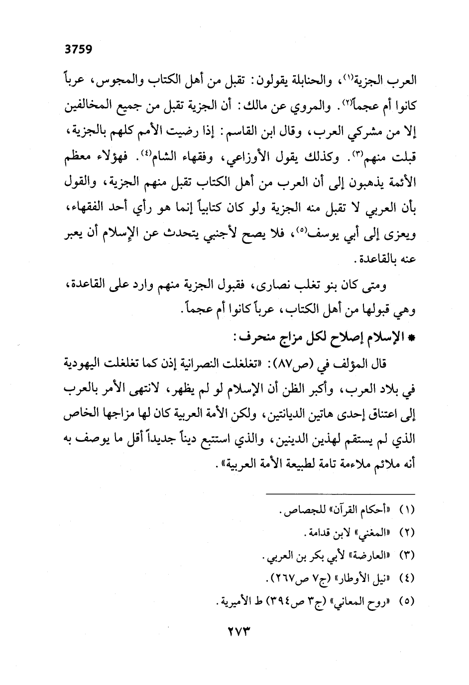 العرب الجزية (¬1)، والحنابلة يقولون: تقبل من أهل الكتاب والمجوس، عرباً كانوا أم عجماً (¬2). والمروي عن مالك: أن الجزية تقبل من جميع المخالفين إلا من مشركي العرب، وقال ابن القاسم: إذا رضيت الأمم كلهم بالجزية، قبلت منهم (¬3). وكذلك يقول الأوزاعي، وفقهاء الشام (¬4). فهؤلاء معظم الأئمة يذهبون إلى أن العرب من أهل الكتاب تقبل منهم الجزية، والقول بأن العربي لا تقبل منه الجزية ولو كان كتابيأ إنما هو رأي أحد الفقهاء، ويعزى إلى أبي يوسف (¬5)، فلا يصح لأجنبي يتحدث عن الإِسلام أن يعبر عنه بالقاعدة.