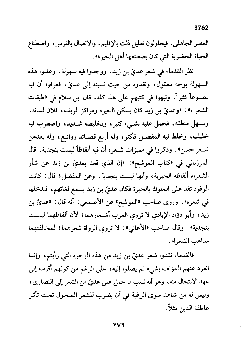 فالقدماء نقدوا شعر عديّ بن زيد من هذه الوجوه التي رأيتم، وإنما انفرد عنهم المؤلف بشيء لم يصلوا إليه، على الرغم من كونهم أقرب إلى عهد الانتحال منه، وهو أنه نسب ما حمل على عديّ من الشعر إلى النصارى، وليس له من شاهد سوى الرغبة في أن يضرب للشعر المنحول تحت تأثير عاطفة الدين مثلاً.