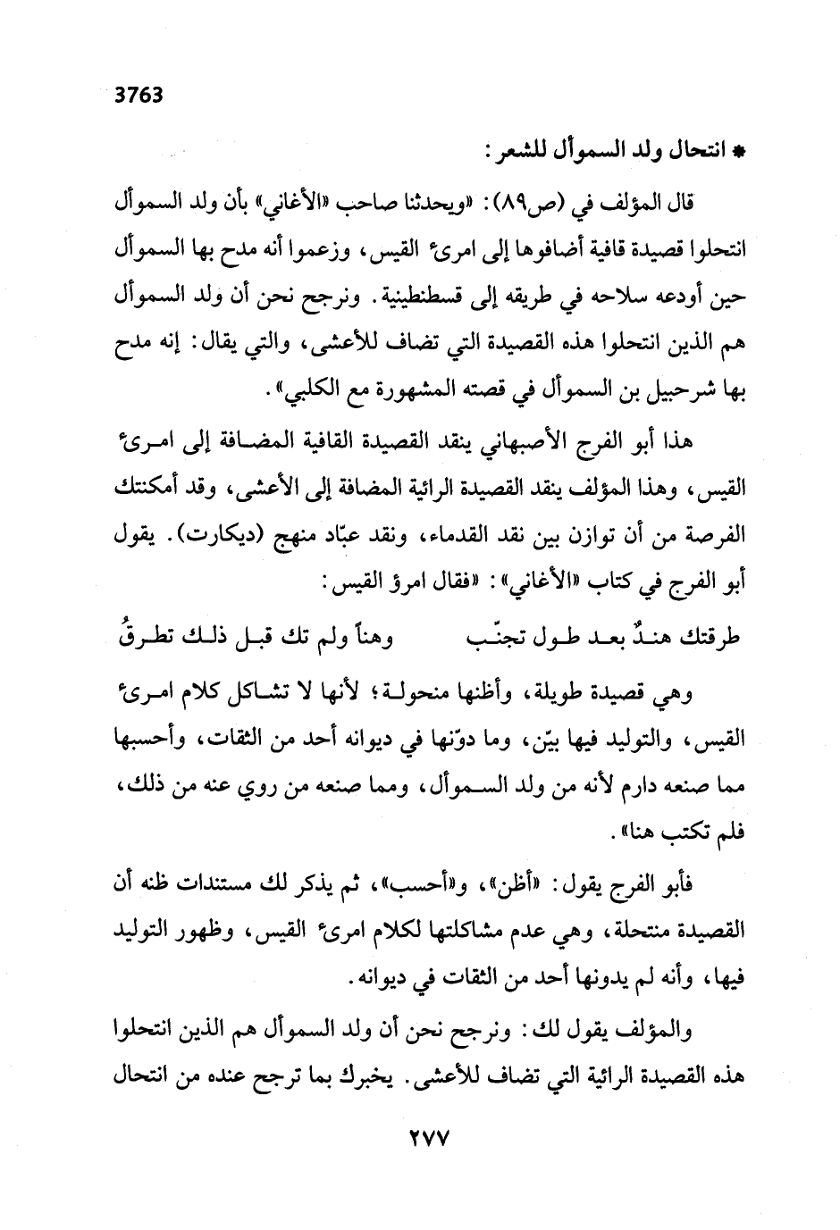 قال المؤلف في (ص 89): "ويحدثنا صاحب "الأغاني" بأن ولد السموأل انتحلوا قصيدة قافية أضافوها إلى امرئ القيس، وزعموا أنه مدح بها السموأل حين أودعه سلاحه في طريقه إلى قسطنطينية. ونرجح نحن أن ولد السموأل هم الذين انتحلوا هذه القصيدة التي تضاف للأعشى، والتي يقال: إنه مدح بها شرحبيل بن السموأل في قصته المشهورة مع الكلبي".