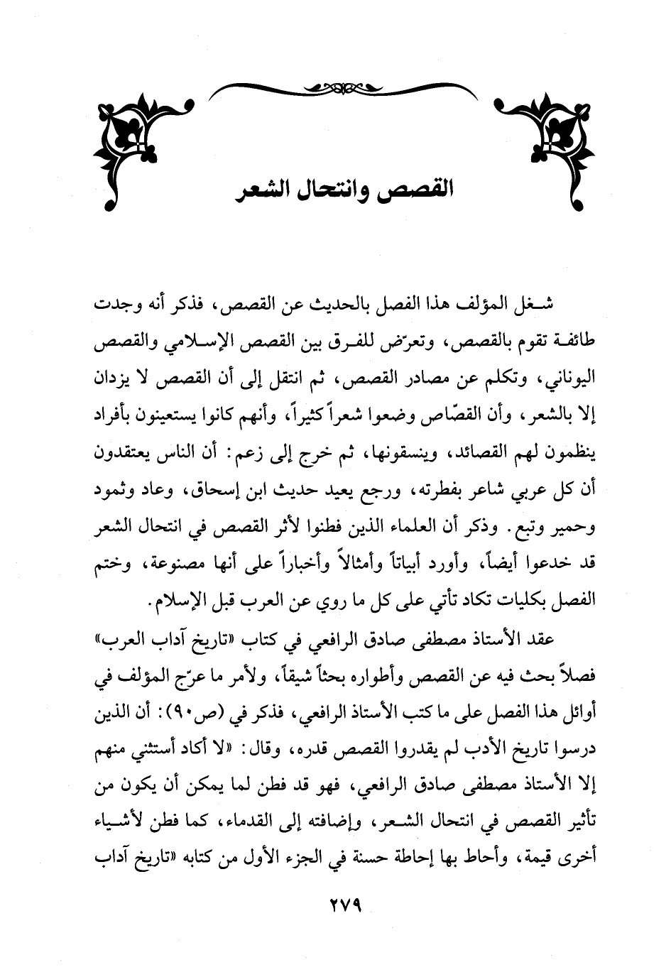 شغل المؤلف هذا الفصل بالحديث عن القصص، فذكر أنه وجدت طائفة تقوم بالقصص، وتعرّض للفرق بين القصص الإِسلامي والقصص اليوناني، وتكلم عن مصادر القصص، ثم انتقل إلى أن القصص لا يزدان إلا بالشعر، وأن القصّاص وضعوا شعراً كثيراً، وأنهم كانوا يستعينون بأفراد ينظمون لهم القصائد، وينسقونها، ثم خرج إلى زعم: أن الناس يعتقدون أن كل عربي شاعر بفطرته، ورجع يعيد حديث ابن إسحاق، وعاد وثمود وحمير وتبع. وذكر أن العلماء الذين فطنوا لأثر القصص في انتحال الشعر قد خدعوا أيضاً، وأورد أبياتاً وأمثالاً وأخباراً على أنها مصنوعة، وختم الفصل بكليات تكاد تأتي على كل ما روي عن العرب قبل الإِسلام. عقد الأستاذ مصطفى صادق الرافعي في كتاب "تاريخ آداب العرب" فصلاً بحث فيه عن القصص وأطواره بحثاً شيقاً، ولأمر ما عرّج المؤلف في أوائل هذا الفصل على ما كتب الأستاذ الرافعي، فذكر في (ص 90): أن الذين درسوا تاريخ الأدب لم يقدروا القصص قدره، وقال: "لا أكاد أستثني منهم إلا الأستاذ مصطفى صادق الرافعي، فهو قد فطن لما يمكن أن يكون من تأثير القصص في انتحال الشعر، داضافته إلى القدماء، كما فطن لأشياء أخرى قيمة، وأحاط بها إحاطة حسنة في الجزء الأول من كتابه "تاريخ آداب