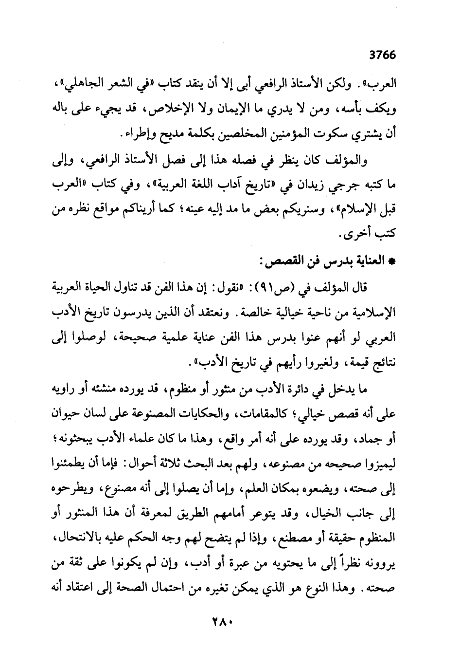 العرب". ولكن الأستاذ الرافعي أبى إلا أن ينقد كتاب "في الشعر الجاهلي"، ويكف بأسه، ومن لا يدري ما الإيمان ولا الإخلاص، قد يجيء على باله أن يشتري سكوت المؤمنين المخلصين بكلمة مديح وإطراء.