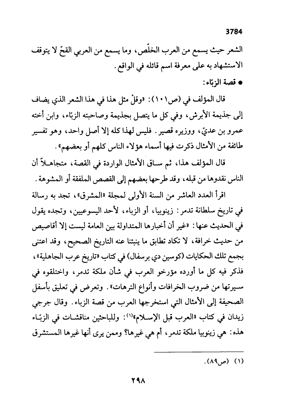 قال المؤلف هذا، ثم ساق الأمثال الواردة في القصة، متجاهلاً أن الناس نقدوها من قبله، وقد طرحها بعضهم إلى القصص الملفقة أو المشوهة. اقرأ العدد العاشر من السنة الأولى لمجلة "المشرق"، تجد به رسالة في تاريخ سلطانة تدمر: زينوبيا، أو الزباء، لأحد اليسوعيين، وتجده يقول في الحديث عنها: "غير أن أخبارها المتداولة بين العامة ليست إلا أقاصيص من حديث خرافة، لا تكاد تطابق ما ينبئنا عنه التاريخ الصحيح، وقد اعتنى بجمع تلك الحكايات (كوسين دي برسفال) في كتاب "تاريخ عرب الجاهلية"، فذكر فيه كل ما أورده مؤرخو العرب في شأن ملكة تدمر، واختلقوه في سيرتها من ضروب الخرافات وأنواع الترهات". وتعرض في تعليق بأسفل الصحيفة إلى الأمثال التي استخرجها العرب من قصة الزباء. وقال جرجي زيدان في كتاب "العرب قبل الإِسلام" (¬1): وللباحثين مناقشات في الزبّاء هذه: هي زينوبيا ملكة تدمر، أم هي غيرها؟ وممن يرى أنها غيرها المستشرق