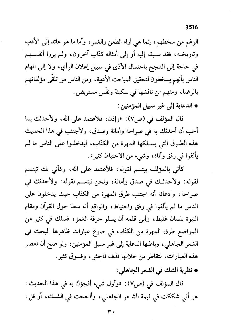 كأني بالمؤلف يبتسم لقوله: فلأعتمد على الله، وكأني بك تبتسم لقوله: ولأحدثك في صدق وأمانة، ونحن نبتسم لقوله: ولأحدثك في صراحة، وادعائه أنه اجتنب طرق المهرة من الكتّاب حيث يدخلون على الناس ما لم يألفوا في رفق واحتياط، والواقع أنه سطا حول القرآن ومقام النبوة بلسان غليظ، وأبى قلمه أن يسلو حرفة الغمز، فسلك في كثير من المواضع طرق المهرة من الكتّاب في صوغ عبارات ظاهرها البحث في الشعر الجاهلي، وباطنها الدعاية إلى غير سبيل المؤمنين، ولو صح أن تعصر هذه العبارات، لتقاطر من خلالها قذف فاحش، وفسوق كثير.