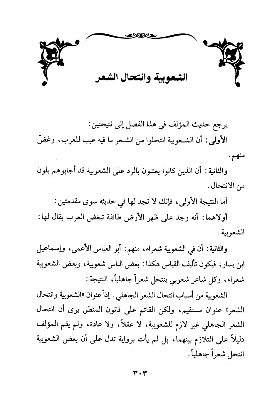 الشعوبية من أسباب انتحال الشعر الجاهلي. إذاً عنوان "الشعويية وانتحال الشعر" عنوان مستقيم، ولكن القائم على قانون المنطق يرى أن انتحال الشعر الجاهلي غير لازم للشعوبية، لا عقلاً، ولا عادة، ولم يقم المؤلف دليلاً على التلازم بينهما، بل لم يأت برواية تدل على أن بعض الشعوبية انتحل شعراً جاهلياً.