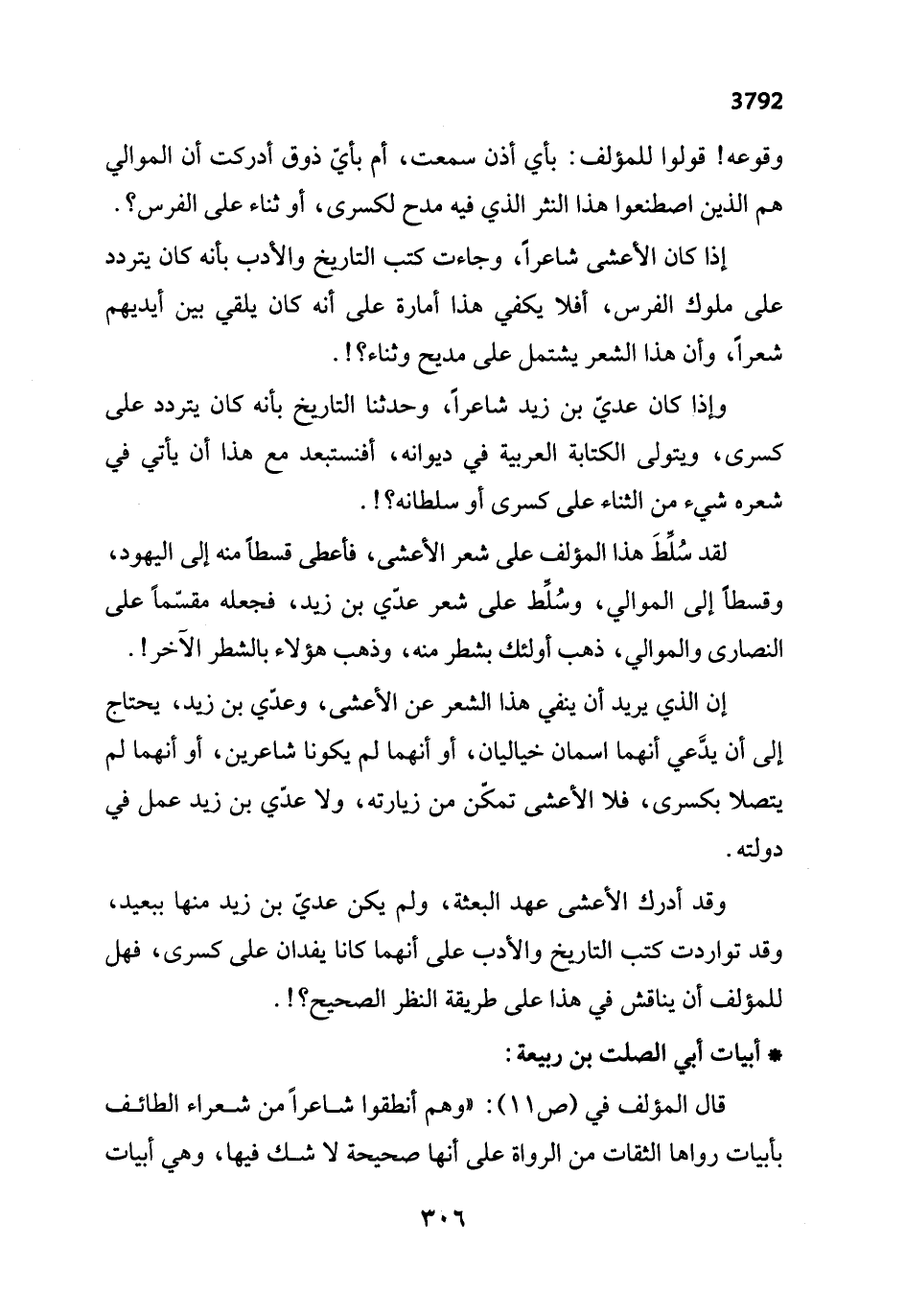 وقد أدرك الأعشى عهد البعثة، ولم يكن عديّ بن زيد منها ببعيد، وقد تواردت كتب التاريخ والأدب على أنهما كانا يفدان على كسرى، فهل للمؤلف أن يناقش في هذا على طريقة النظر الصحيح؟!.