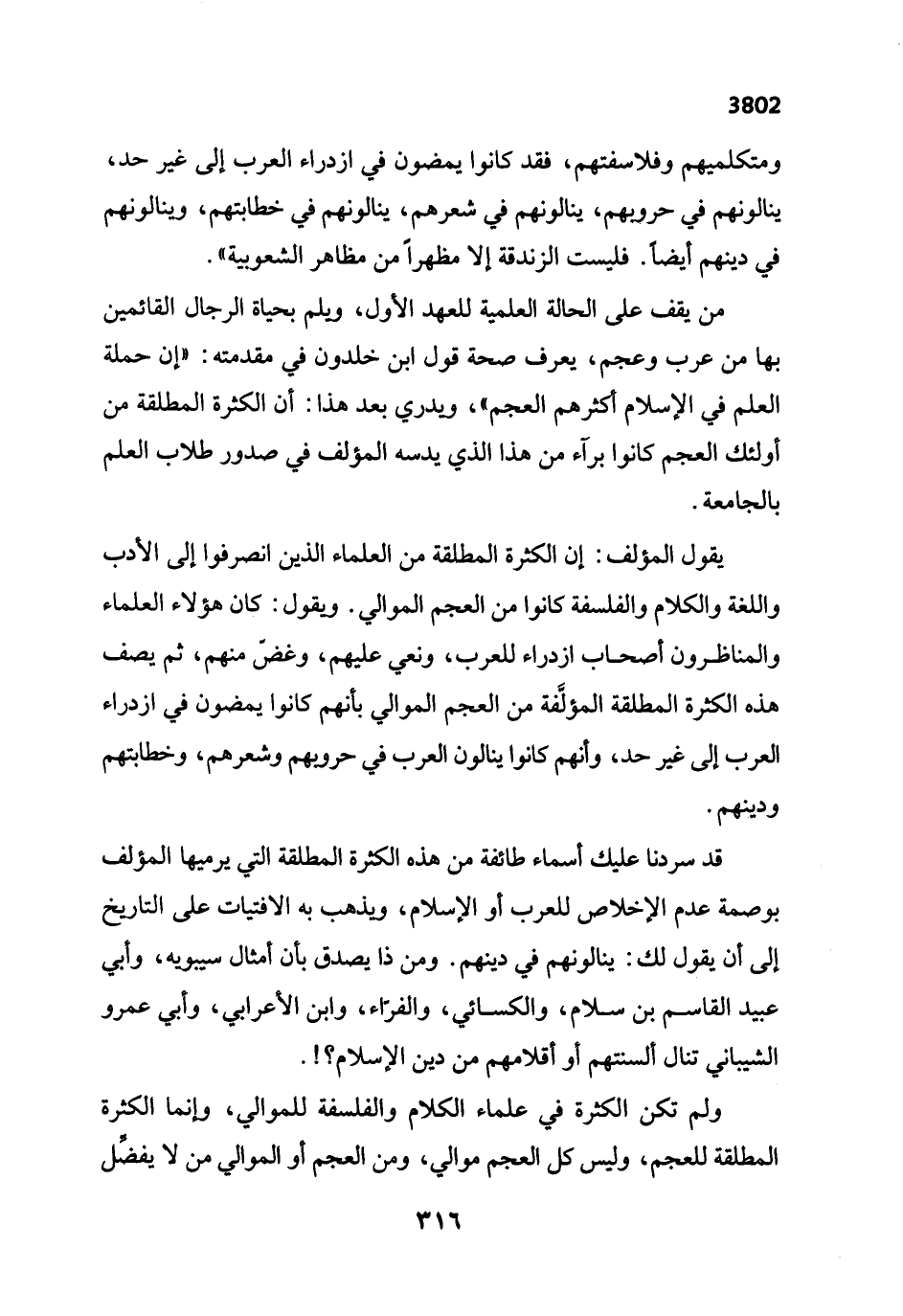 يقول المؤلف: إن الكثرة المطلقة من العلماء الذين انصرفوا إلى الأدب واللغة والكلام والفلسفة كانوا من العجم الموالي. ويقول: كان هؤلاء العلماء والمناظرون أصحاب ازدراء للعرب، ونعي عليهم، وغضّ منهم، ثم يصف هذه الكثرة المطلقة المؤلَّفة من العجم الموالي بأنهم كانوا يمضون في ازدراء العرب إلى غير حد، وأنهم كانوا ينالون العرب في حروبهم وشعرهم، وخطابتهم ودينهم.