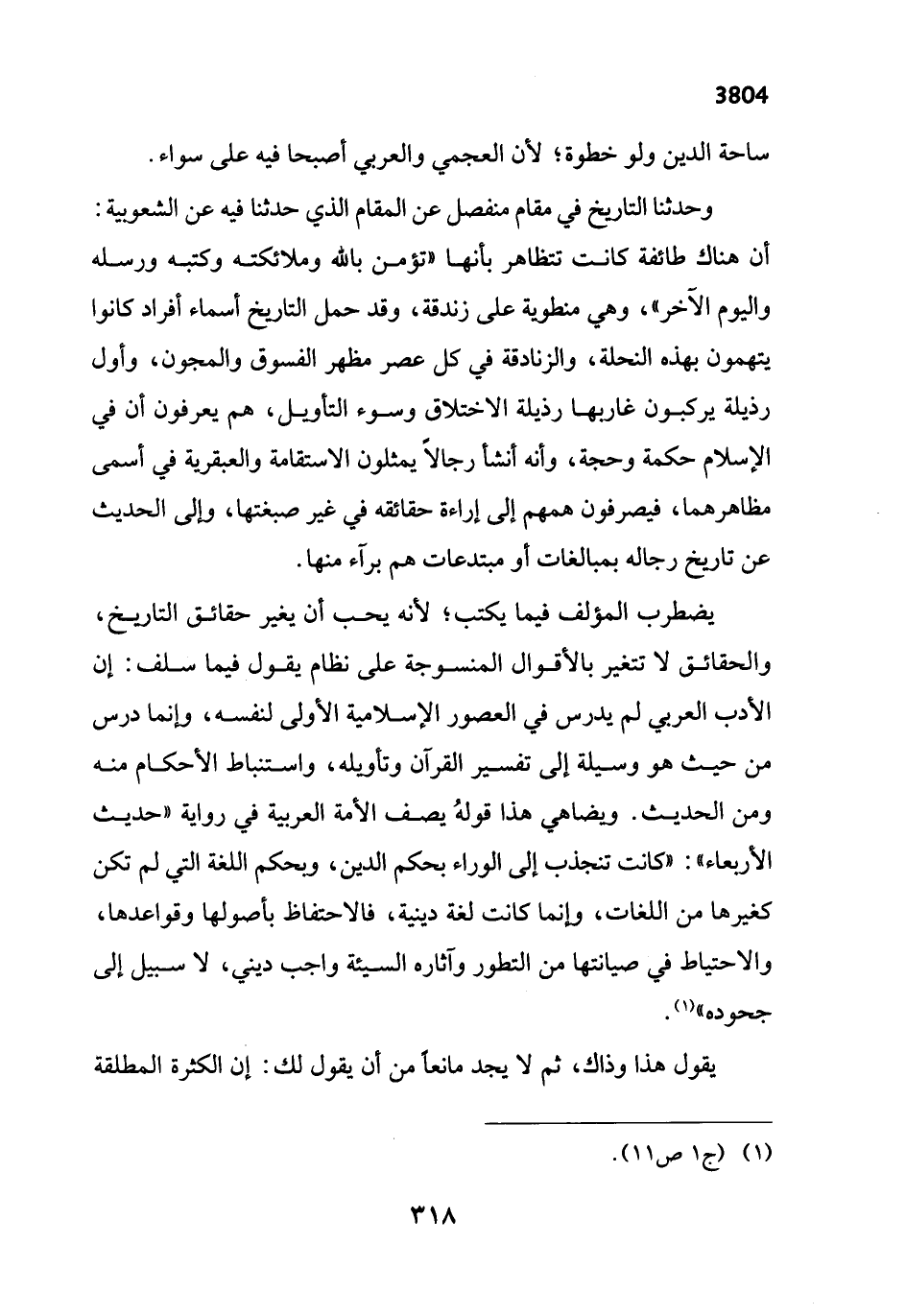 يضطرب المؤلف فيما يكتب؛ لأنه يحب أن يغير حقائق التاريخ، والحقائق لا تتغير بالأقوال المنسوجة على نظام يقول فيما سلف: إن الأدب العربي لم يدرس في العصور الإِسلامية الأولى لنفسه، وإنما درس من حيث هو وسيلة إلى تصير القرآن وتأويله، واستنباط الأحكام منه ومن الحديث. ويضاهي هذا قولهُ يصف الأمة العربية في رواية "حديث الأربعاء": "كانت تنجذب إلى الوراء بحكم الدين، وبحكم اللغة التي لم تكن كغيرها من اللغات، وإنما كانت لغة دينية، فالاحتفاظ بأصولها وقواعدها، والاحتياط في صيانتها من التطور وآثاره السيئة واجب ديني، لا سبيل إلى جحوده" (¬1).