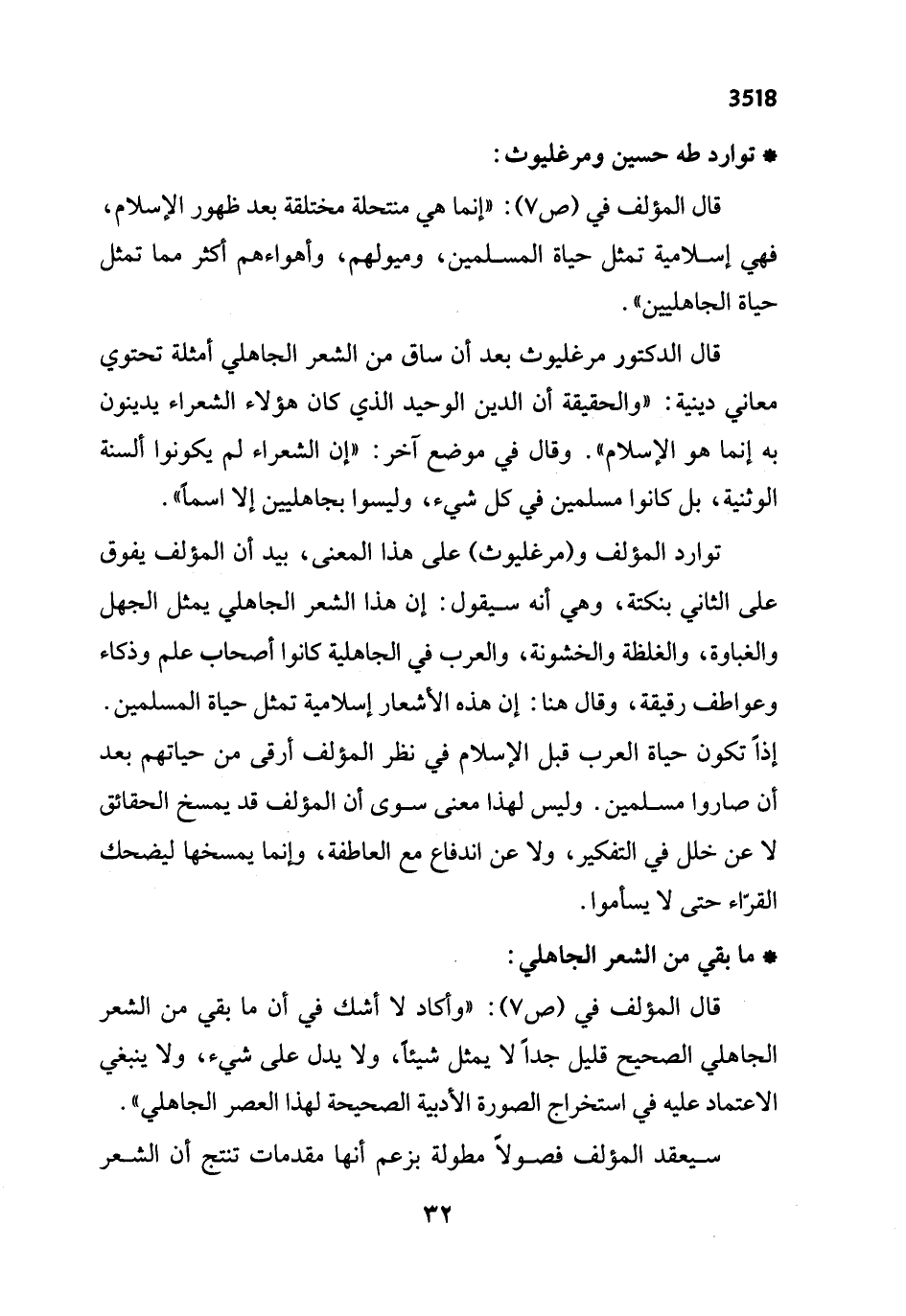 توارد المؤلف و (مرغليوث) على هذا المعنى، بيد أن المؤلف يفوق على الثاني بنكتة، وهي أنه سيقول: إن هذا الشعر الجاهلي يمثل الجهل والغباوة، والغلظة والخشونة، والعرب في الجاهلية كانوا أصحاب علم وذكاء وعواطف رقيقة، وقال هنا: إن هذه الأشعار إسلامية تمثل حياة المسلمين. إذاً تكون حياة العرب قبل الإسلام في نظر المؤلف أرقى من حياتهم بعد أن صاروا مسلمين. وليس لهذا معنى سوى أن المؤلف قد يمسخ الحقائق لا عن خلل في التفكير، ولا عن اندفاع مع العاطفة، وإنما يمسخها ليضحك القرّاء حتى لا يساموا.