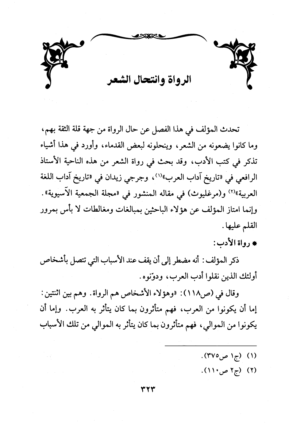 تحدث المؤلف في هذا الفصل عن حال الرواة من جهة قلة الثقة بهم، وما كانوا يضعونه من الشعر، وينحلونه لبعض القدماء، وأورد في هذا أشياء تذكر في كتب الأدب، وقد بحث في رواة الشعر من هذه الناحية الأستاذ الرافعي في "تاريخ آداب العرب" (¬1)، وجرجي زيدان في "تاريخ آداب اللغة العربية" (¬2) و (مرغليوث) في مقاله المنشور في "مجلة الجمعية الآسيوية".