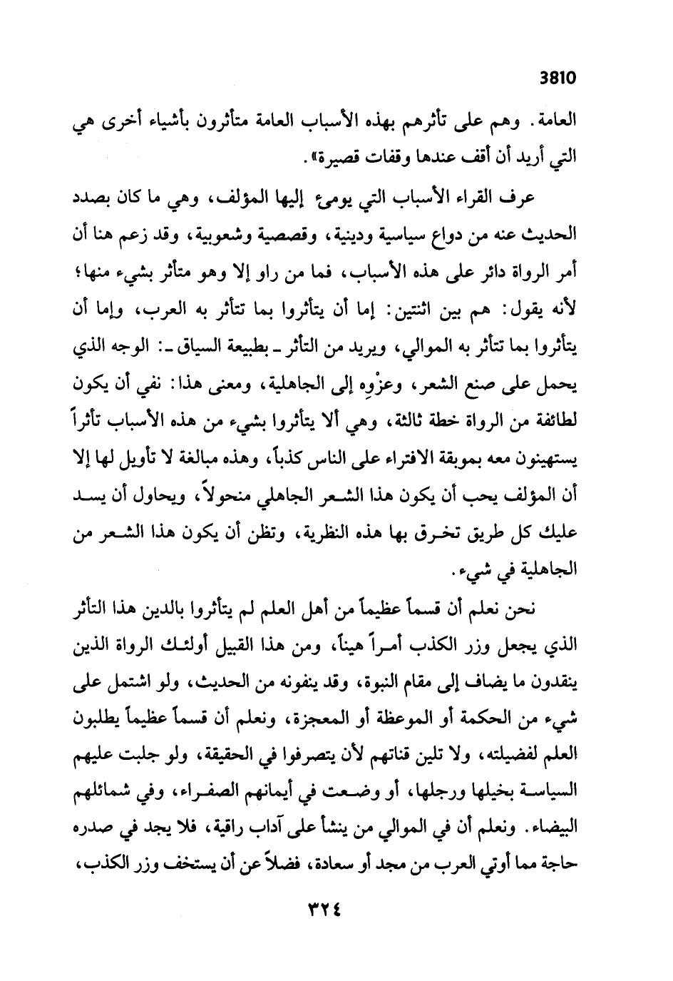 نحن نعلم أن قسماً عظيماً من أهل العلم لم يتأثروا بالدين هذا التأثر الذي يجعل وزر الكذب أمراً هينا، ومن هذا القبيل أولىك الرواة الذين ينقدون ما يضاف إلى مقام النبوة، وقد ينفونه من الحديث، ولو اشتمل على شيء من الحكمة أو الموعظة أو المعجزة، ونعلم أن قسماً عظيماً يطلبون العلم لفضيلته، ولا تلين قناتهم لأن يتصرفوا في الحقيقة، ولو جلبت عليهم السياسة بخيلها ورجلها، أو وضعت في أيمانهم الصفراء، وفي شمائلهم البيضاء. ونعلم أن في الموالي من ينشأ على آداب راقية، فلا يجد في صدره حاجة مما أوتي العرب من مجد أو سعادة، فضلاً عن أن يستخف وزر الكذب،