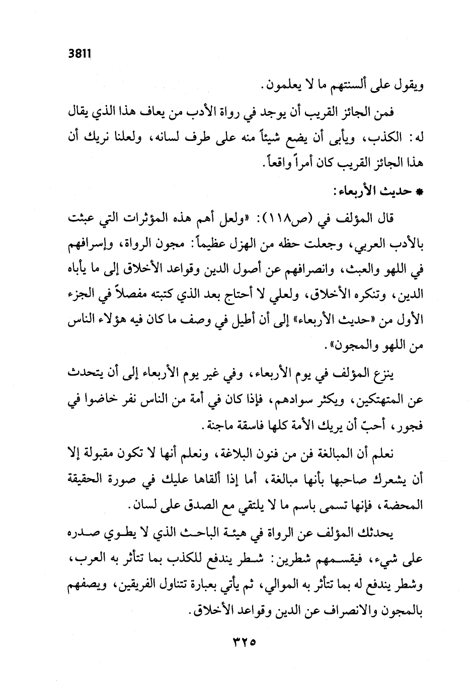 قال المؤلف في (ص 118): "ولعل أهم هذه المؤثرات التي عبثت بالأدب العربي، وجعلت حظه من الهزل عظيماً: مجون الرواة، وإسرافهم في اللهو والعبث، وانصرافهم عن أصول الدين وقواعد الأخلاق إلى ما يأباه الدين، وتنكره الأخلاق، ولعلي لا أحتاج بعد الذي كتبته مفصلاً في الجزء الأول من "حديث الأربعاء" إلى أن أطيل في وصف ما كان فيه هؤلاء الناس من اللهو والمجون".