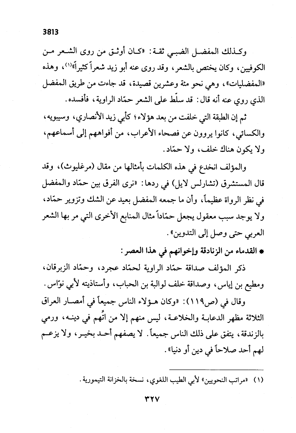 والمؤلف انخدع في هذه الكلمات بأمثالها من مقال (مرغليوث)، وقد قال المستشرق (تشارلس لايل) في ردها: "نرى الفرق بين حمّاد والمفضل في نظر الرواة عظيماً، وأن ما جمعه المفضل بعيد عن الشك وتزوير حمّاد، ولا يوجد سبب معقول يجعل حمّاداً مثال المنابع الأخرى التي مر بها الشعر العربي حتى وصل إلى التدوين".