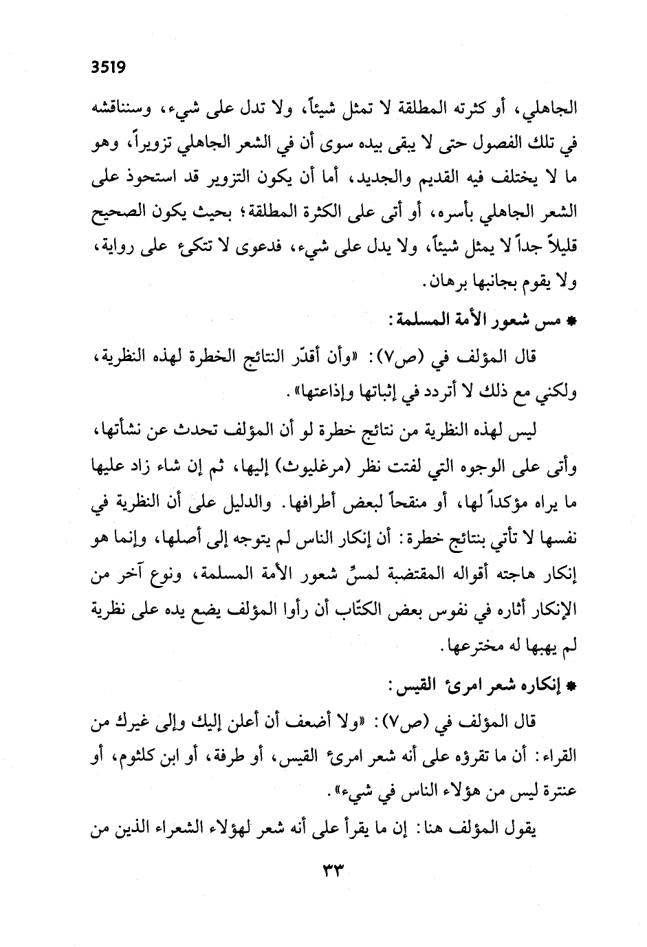 الجاهلي، أو كثرته المطلقة لا تمثل شيئاً، ولا تدل على شيء، وسنناقشه في تلك الفصول حتى لا يبقى بيده سوى أن في الشعر الجاهلي تزويراً، وهو ما لا يختلف فيه القديم والجديد، أما أن يكون التزوير قد استحوذ على الشعر الجاهلي بأسره، أو أتى على الكثرة المطلقة؛ بحيث يكون الصحيح قليلاً جداً لا يمثل شيئاً، ولا يدل على شيء، فدعوى لا تتكئ على رواية، ولا يقوم بجانبها برهان.