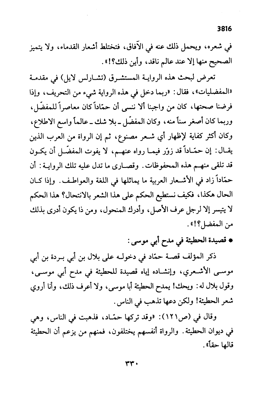 وقال في (ص 121): "وقد تركها حمّاد، فذهبت في الناس، وهي في ديوان الحطيئة. والرواة أنفسهم يختلفون، فمنهم من يزعم أن الحطيئة قالها حقاً".