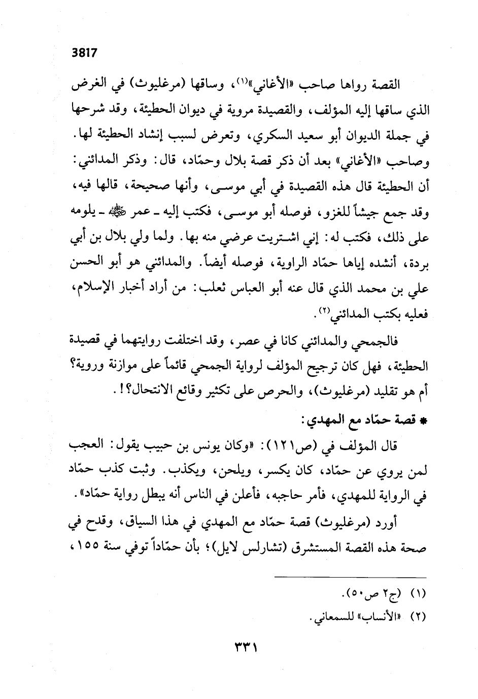 أورد (مرغليوث) قصة حمّاد مع المهدي في هذا السياق، وقدح في صحة هذه القصة المستشرق (تشارلس لايل)؛ بأن حمّاداً توفي سنة 155،