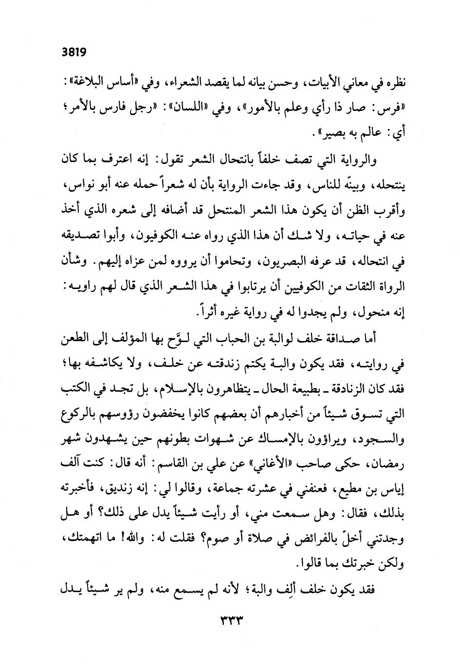 أما صداقة خلف لوالبة بن الحباب التي لوَّح بها المؤلف إلى الطعن في روايته، فقد يكون والبة يكتم زندقته عن خلف، ولا يكاشفه بها؛ فقد كان الزنادقة -بطبيعة الحال- يتظاهرون بالإِسلام، بل تجد في الكتب التي تسوق شيئاً من أخبارهم أن بعضهم كانوا يخفضون رؤوسهم بالركوع والسجود، ويراؤون بالإمساك عن شهوات بطونهم حين يشهدون شهر رمضان، حكى صاحب "الأغاني" عن علي بن القاسم: أنه قال: كنت آلف إياس بن مطيع، فعنفني في عشرته جماعة، وقالوا لي: إنه زنديق، فأخبرته بذلك، فقال: وهل سمعت مني، أو رأيت شيئاً يدل على ذلك؟ أو هل وجدتني أخلّ بالفرائض في صلاة أو صوم؟ فقلت له: والله! ما اتهمتك، ولكن خبرتك بما قالوا.