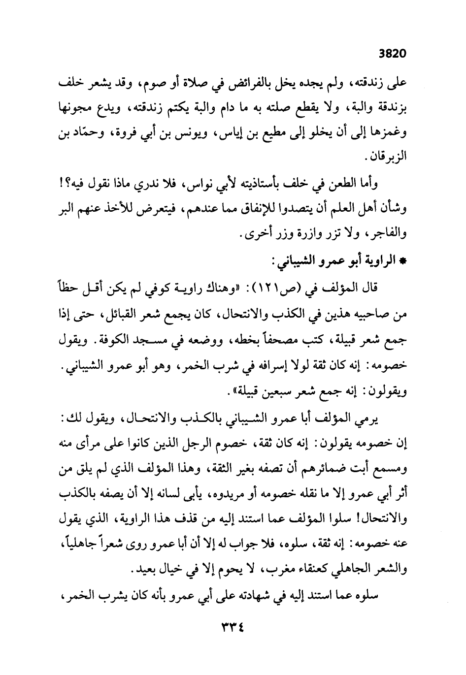 قال المؤلف في (ص 121): "وهناك راوية كوفي لم يكن أقل حظاً من صاحبيه هذين في الكذب والانتحال، كان يجمع شعر القبائل، حتى إذا جمع شعر قبيلة، كتب مصحفاً بخطه، ووضعه في مسجد الكوفة. ويقول خصومه: إنه كان ثقة لولا إسرافه في شرب الخمر، وهو أبو عمرو الشيباني. ويقولون: إنه جمع شعر سبعين قبيلة".