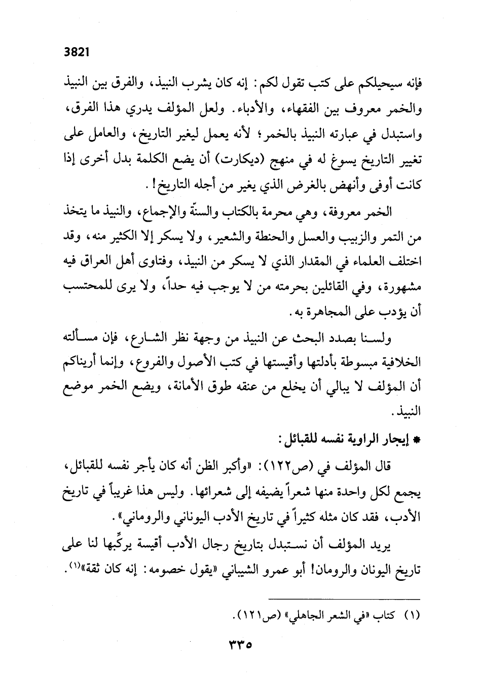 فإنه سيحيلكم على كتب تقول لبهم: إنه كان يشرب النبيذ، والفرق بين النبيذ والخمر معروف بين الفقهاء، والأدباء. ولعل المؤلف يدري هذا الفرق، واستبدل في عبارته النبيذ بالخمر؛ لأنه يعمل ليغير التاريخ، والعامل على تغيير التاريخ يسوغ له في منهج (ديكارت) أن يضع الكلمة بدل أخرى إذا كانت أوفى وأنهض بالغرض الذي يغير من أجله التاريخ!.