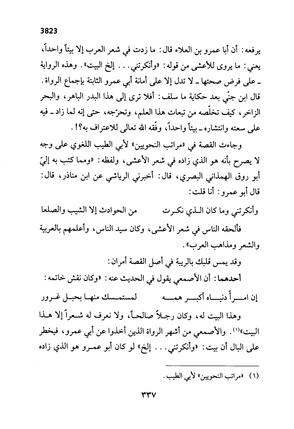 يرفعه: أن أبا عمرو بن العلاء قال: ما زدت في شعر العرب إلا بيتاً واحداً، يعني: ما يروى للأعشى من قوله: "وأنكرتني ... إلخ البيت". وهذه الرواية -على فرض صحتها- لا تدل إلا على أمانة أبي عمرو الثابتة بإجماع الرواة. قال ابن جنّي بعد حكايته ما سلف: أفلا ترى إلى هذا البدر الباهر، والبحر الزاخر، كيف تخلّصه من تبعات هذا العلم، وتحرّجه، حتى إنه لما زاد -فيه على سعته وانتشاره- بيتاً واحداً، وفّقه الله تعالى للاعتراف به؟!.