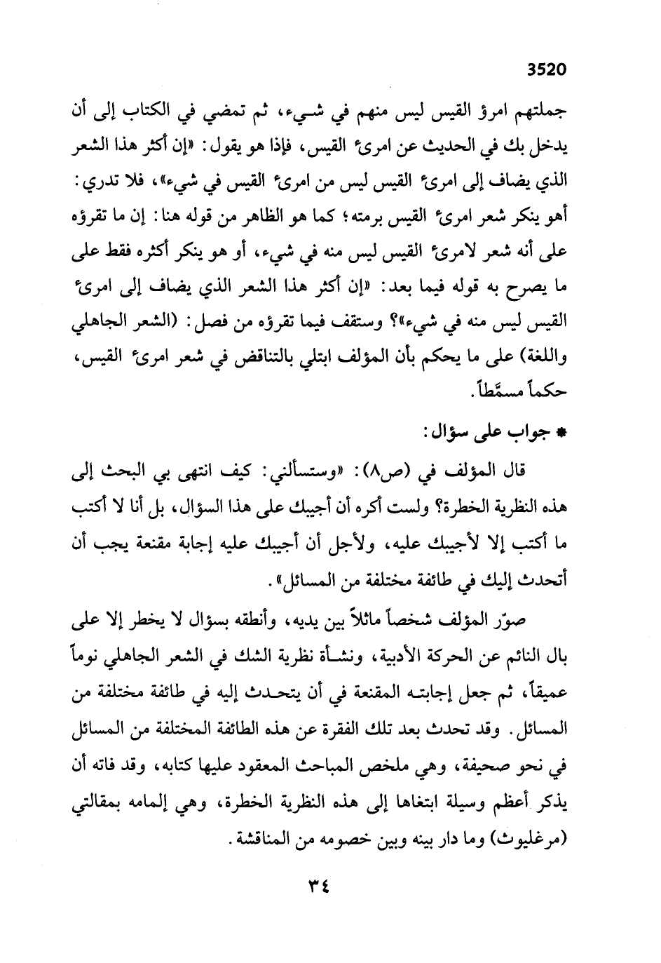 جملتهم امرؤ القيس ليس منهم في شيء، ثم تمضي في الكتاب إلى أن يدخل بك في الحديث عن امرئ القيس، فإذا هو يقول: "إن أكثر هذا الشعر الذي يضاف إلى امرئ القيس ليس من امرئ القيس في شيء"، فلا تدري: أهو ينكر شعر امرئ القيس برمته؛ كما هو الظاهر من قوله هنا: إن ما تقرؤه على أنه شعر لامرئ القيس ليس منه في شيء، أو هو ينكر أكثره فقط على ما يصرح به قوله فيما بعد: "إن أكثر هذا الشعر الذي يضاف إلى امرئ القيس ليس منه في شيء"؟ وستقف فيما تقرؤه من فصل: (الشعر الجاهلي واللغة) على ما يحكم بأن المؤلف ابتلي بالتناقض في شعر امرئ القيس، حكماً مسمَّطاً.