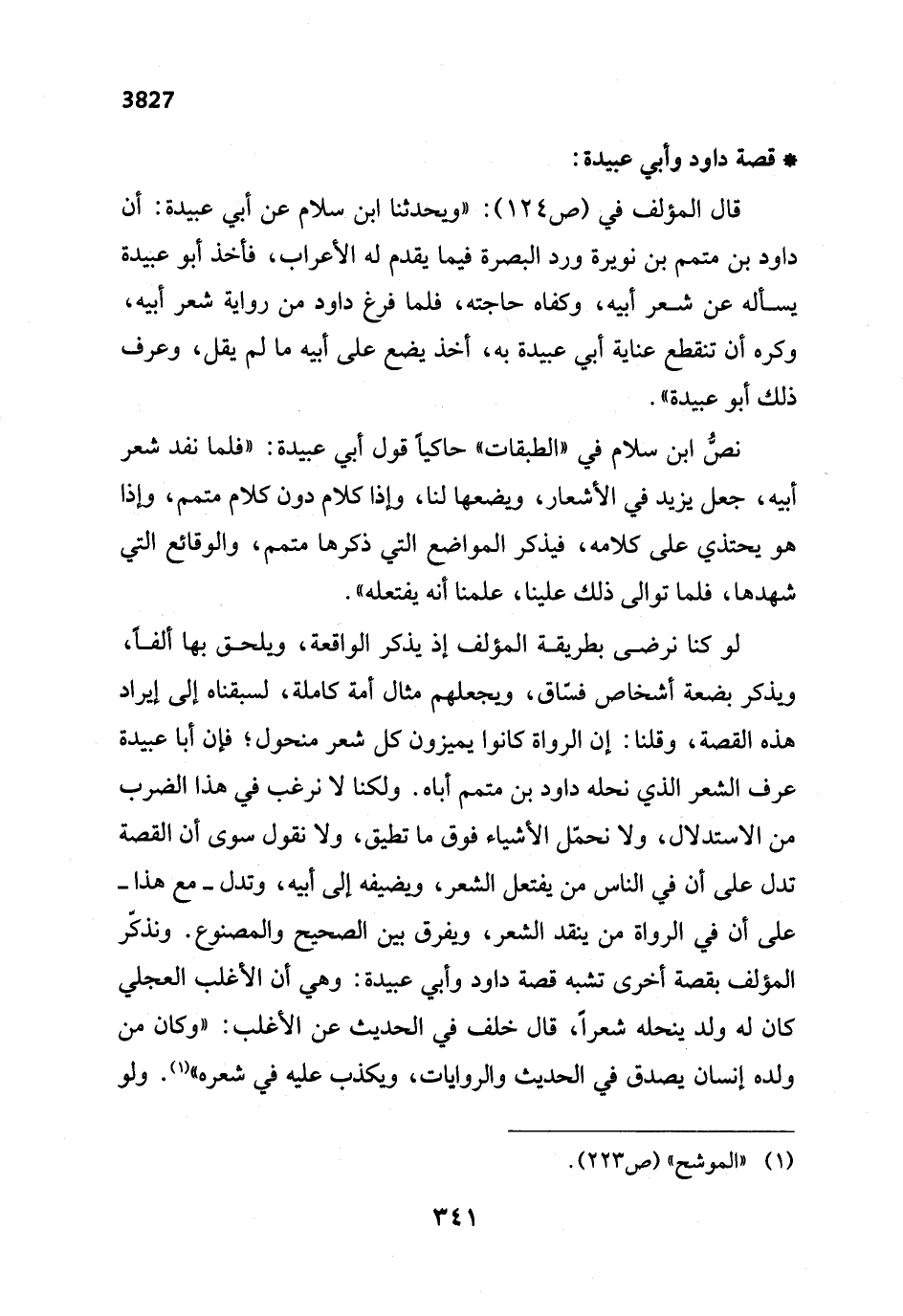 قال المؤلف في (ص 124): "ويحدثنا ابن سلام عن أبي عبيدة: أن داود بن متمم بن نويرة ورد البصرة فيما يقدم له الأعراب، فأخذ أبو عبيدة يسأله عن شعر أبيه، وكفاه حاجته، فلما فرغ داود من رواية شعر أبيه، وكره أن تنقطع عناية أبي عبيدة به، أخذ يضع على أبيه ما لم يقل، وعرف ذلك أبو عبيدة".