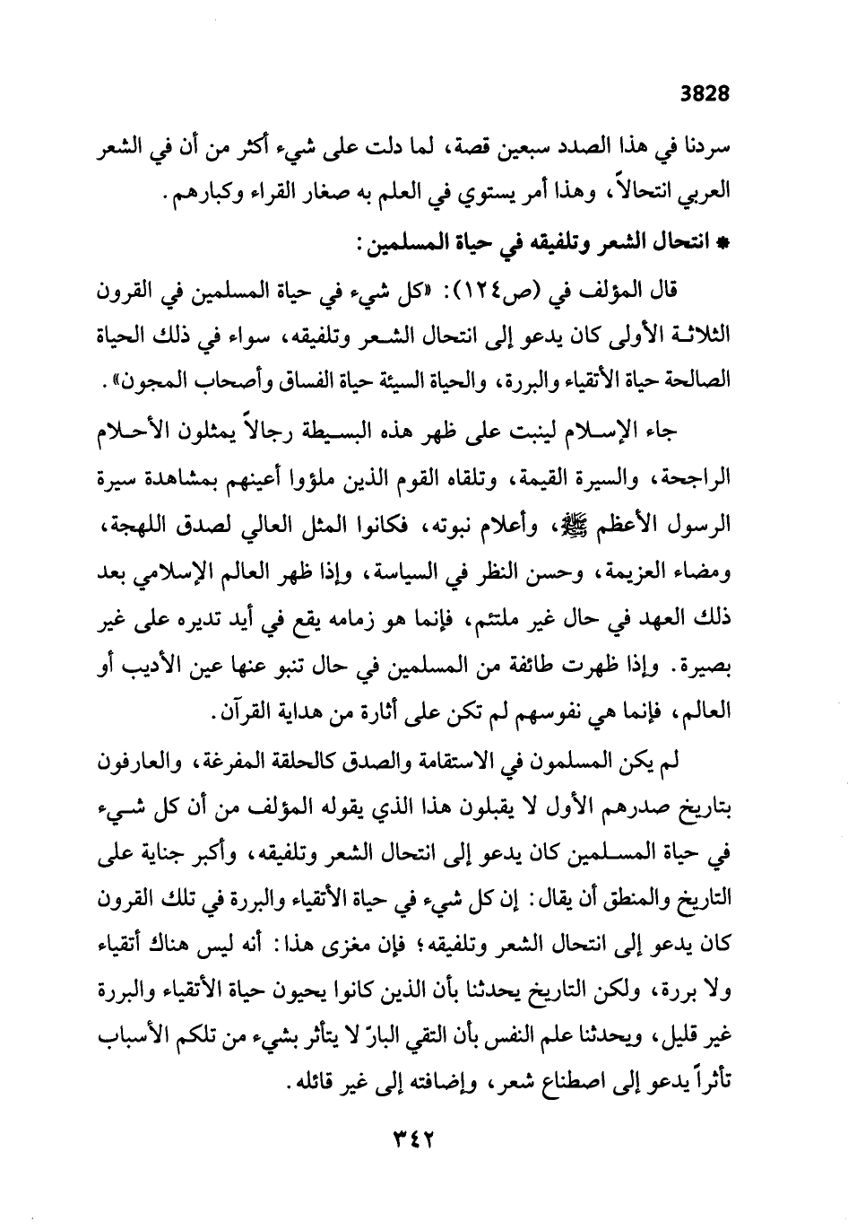 قال المؤلف في (ص 124): "كل شيء في حياة المسلمين في القرون الثلاثة الأولى كان يدعو إلى انتحال الشعر وتلفيقه، سواء في ذلك الحياة الصالحة حياة الأتقياء والبررة، والحياة السيئة حياة الفساق وأصحاب المجنون".