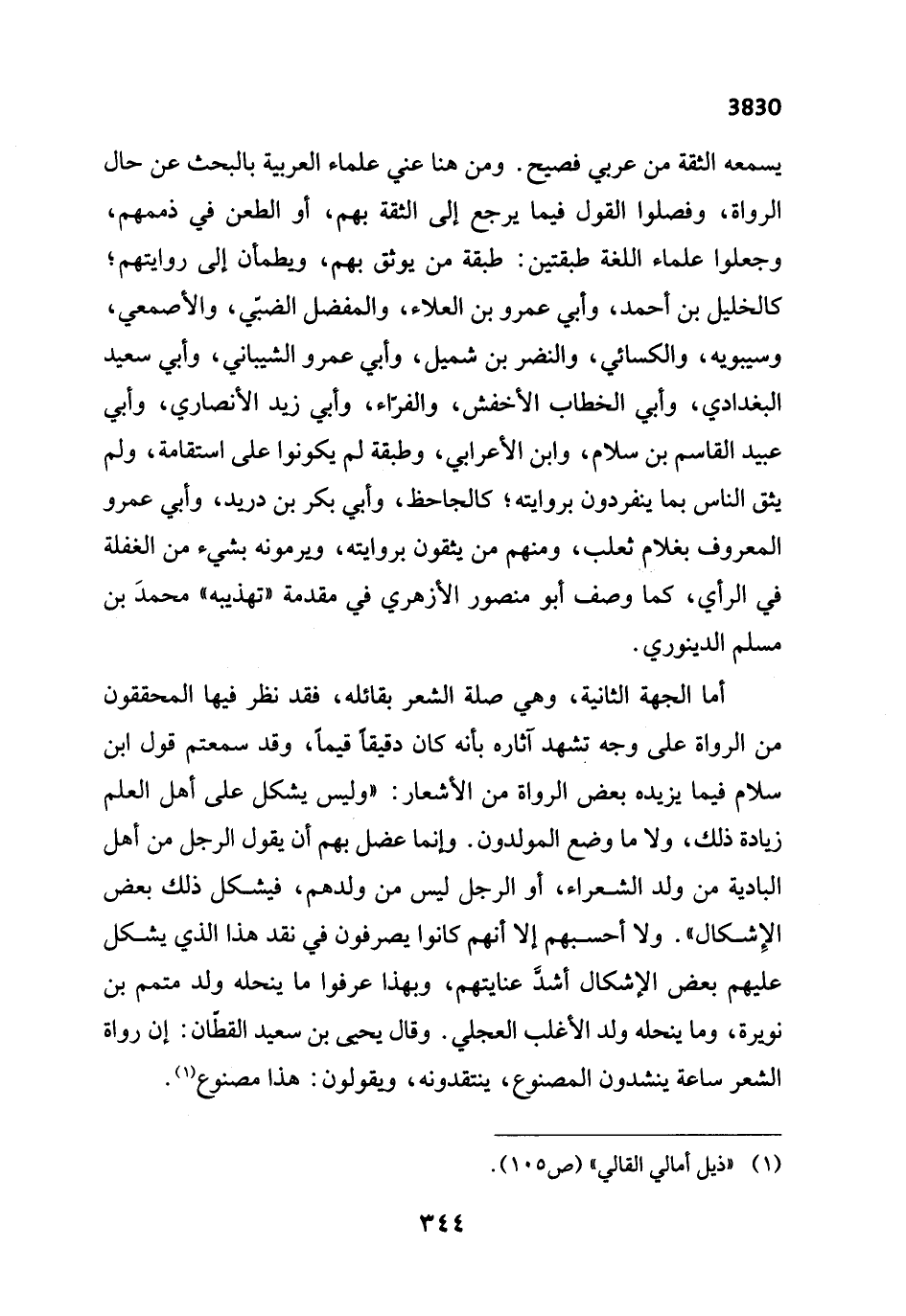 يسمعه الثقة من عربي فصيح. ومن هنا عني علماء العربية بالبحث عن حال الرواة، وفصلوا القول فيما يرجع إلى الثقة بهم، أو الطعن في ذممهم، وجعلوا علماء اللغة طبقتين: طبقة من يوثق بهم، ويطمأن إلى روايتهم؛ كالخليل بن أحمد، وأبي عمرو بن العلاء، والمفضل الضبّي، والأصمعي، وسيبويه، والكسائي، والنضر بن شميل، وأبي عمر والشيباني، وأبي سعيد البغدادي، وأبي الخطاب الأخفش، والفرّاء، وأبي زيد الأنصاري، وأبي عبيد القاسم بن سلام، وابن الأعرابي، وطبقة لم يكونوا على استقامة، ولم يثق الناس بما ينفردون بروايته؛ كالجاحظ، وأبي بكر بن دريد، وأبي عمرو المعروف بغلام ثعلب، ومنهم من يثقون بروايته، ويرمونه بشيء من الغفلة في الرأي، كما وصف أبو منصور الأزهري في مقدمة "تهذيبه" محمدَ بن مسلم الدينوري.