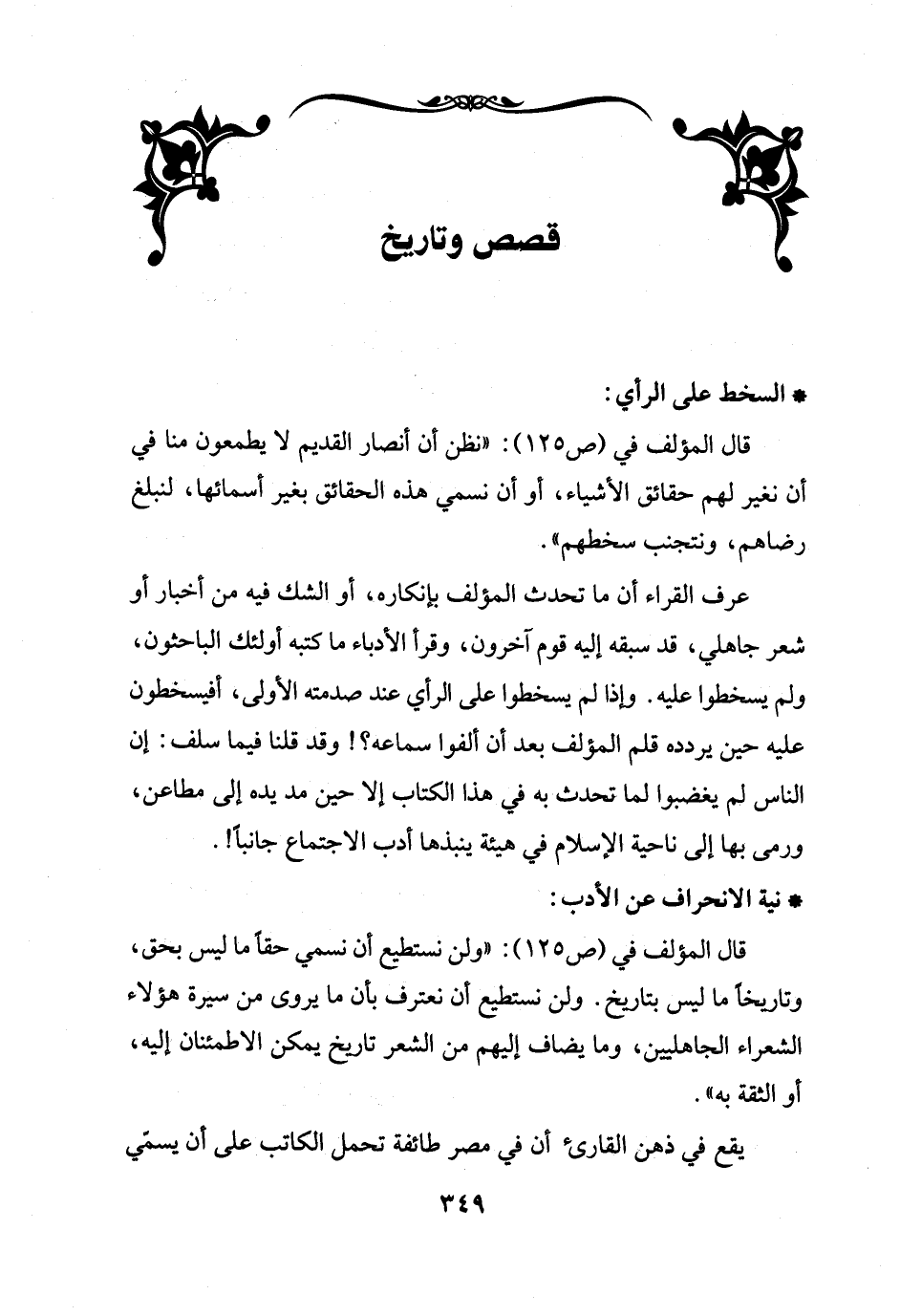 عرف القراء أن ما تحدث المؤلف بإنكاره، أو الشك فيه من أخبار أو شعر جاهلي، قد سبقه إليه قوم آخرون، وقرأ الأدباء ما كتبه أولئك الباحثون، ولم يسخطوا عليه. وإذا لم يسخطوا على الرأي عند صدمته الأولى، أفيسخطون عليه حين يردده قلم المؤلف بعد أن ألفوا سماعه؟! وقد قلنا فيما سلف: إن الناس لم يغضبوا لما تحدث به في هذا الكتاب إلا حين مد يده إلى مطاعن، ورمى بها إلى ناحية الإِسلام في هيئة ينبذها أدب الاجتماع جانباً!.