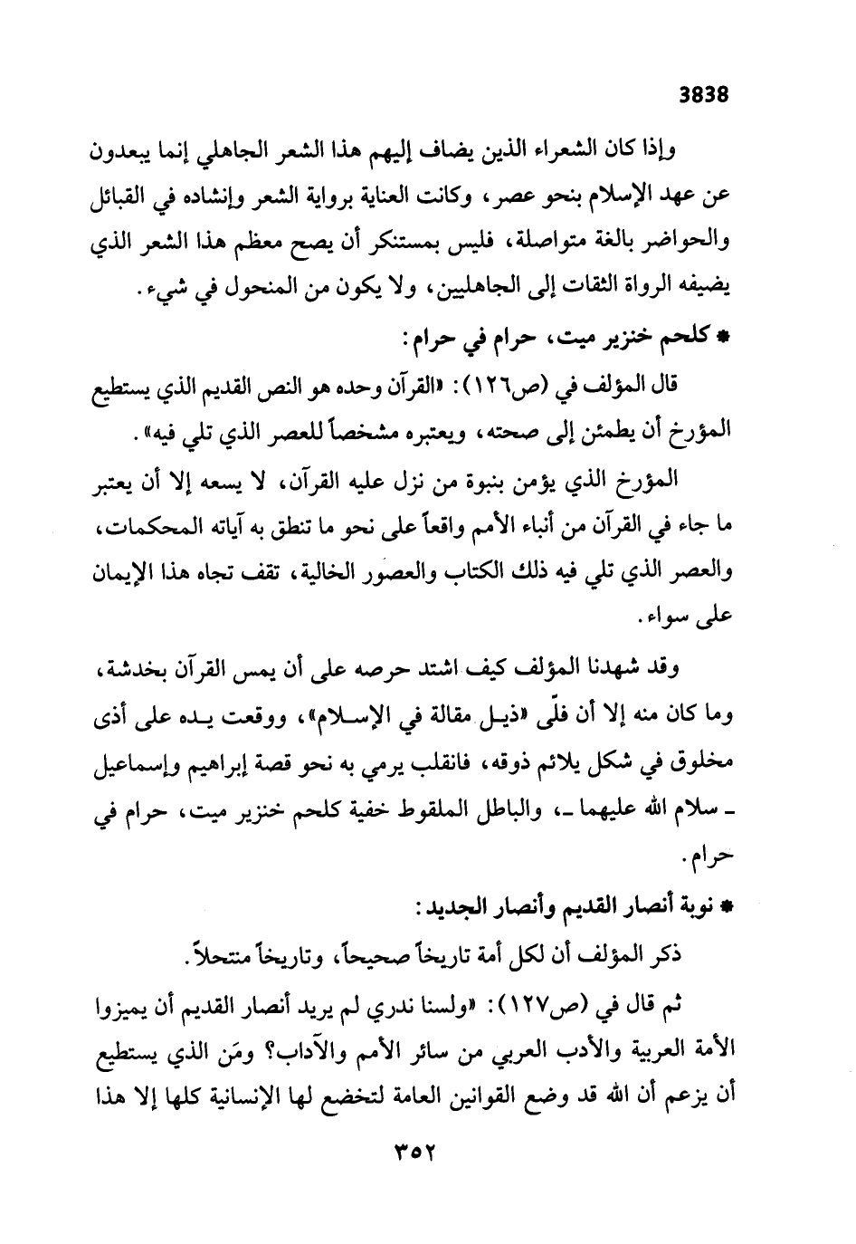 ثم قال في (ص 127): "ولسنا ندري لم يريد أنصار القديم أن يميزوا الأمة العربية والأدب العربي من سائر الأمم والآداب؟ ومَن الذي يستطيع أن يزعم أن الله قد وضع القوانين العامة لتخضع لها الإنسانية كلها إلا هذا