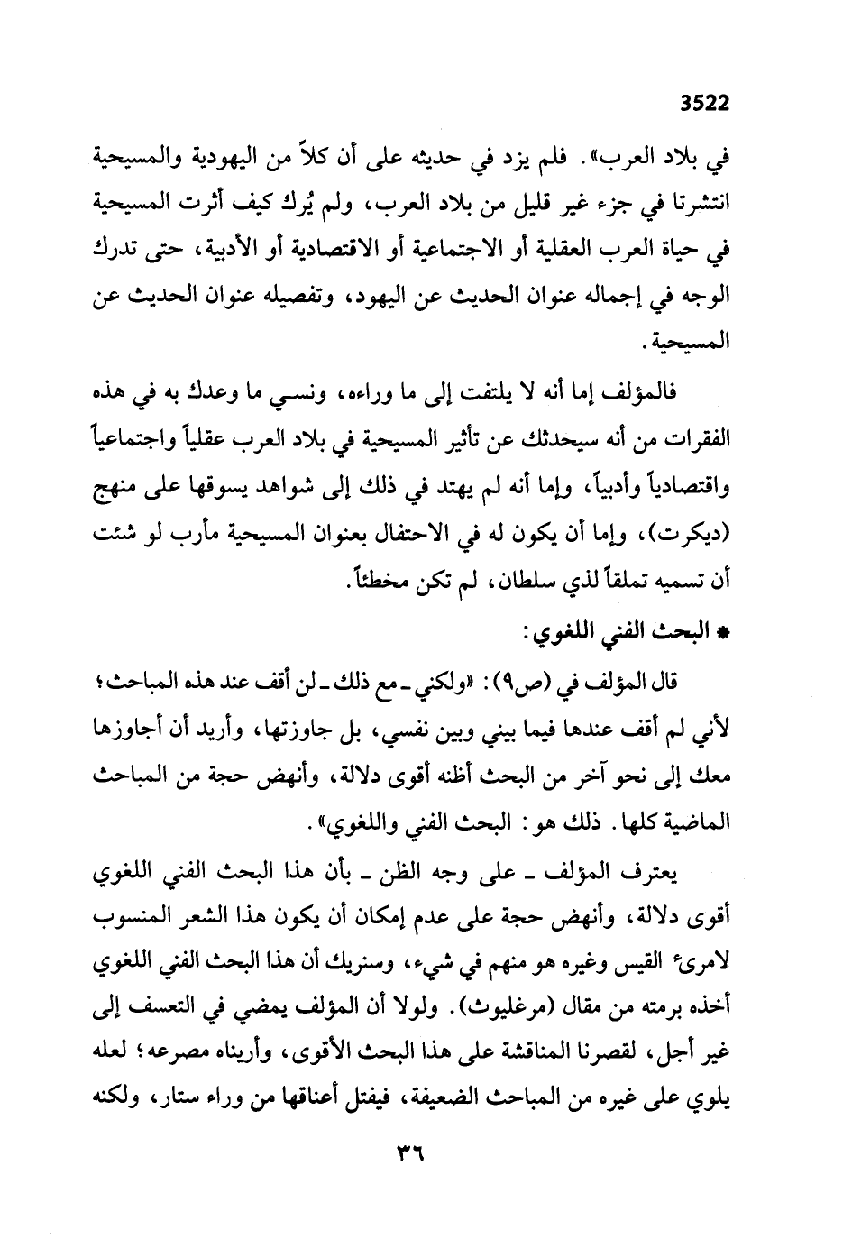 في بلاد العرب". فلم يزد في حديثه على أن كلاً من اليهودية والمسيحية انتشرتا في جزء غير قليل من بلاد العرب، ولم يُرك كيف أثرت المسيحية في حياة العرب العقلية أو الاجتماعية أو الاقتصادية أو الأدبية، حتى تدرك الوجه في إجماله عنوان الحديث عن اليهود، وتفصيله عنوان الحديث عن المسيحية.