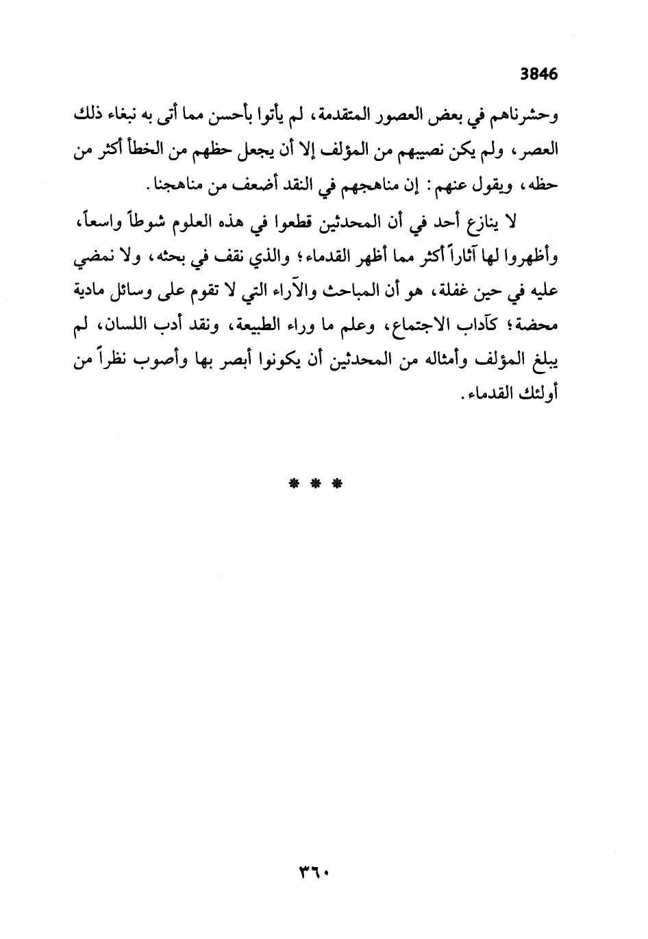 وحشرناهم في بعض العصور المتقدمة، لم يأتوا بأحسن مما أتى به نبغاء ذلك العصر، ولم يكن نصيبهم من المؤلف إلا أن يجعل حظهم من الخطأ أكثر من حظه، ويقول عنهم: إن مناهجهم في النقد أضعف من مناهجنا.