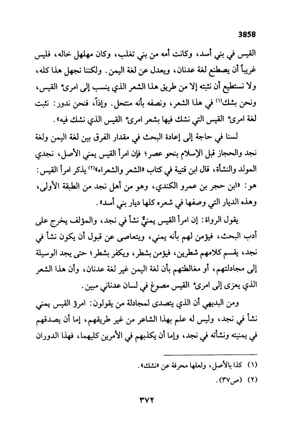 يقول الرواة: إن امرأ القيس يمنيٌّ نشأ في نجد، والمؤلف يخرج على أدب البحث، فيؤمن لهم بأنه يمني، ويتعاصى عن قبول أن يكون نشأ في نجد، يقسم كلامهم شطرين، فيؤمن بشطر، ويكفر بشطر؛ حتى يجد الوسيلة إلى مجادلتهم، أو مغالطتهم بأن لغة اليمن غير لغة عدنان، وأن هذا الشعر الذي يعزى إلى امرئ القيس مصوغ في لسان عدناني مبين.