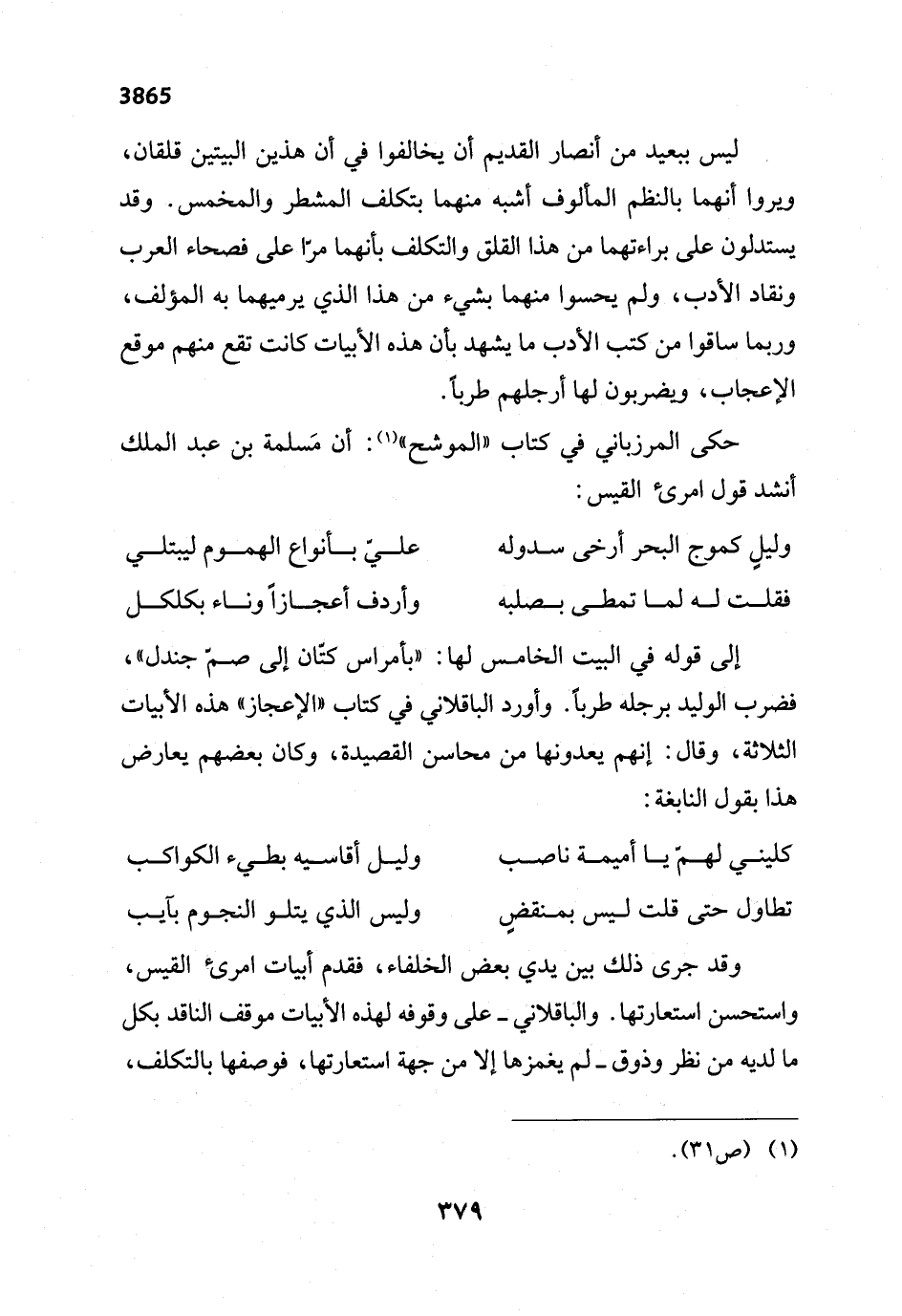 وقد جرى ذلك بين يدي بعض الخلفاء، فقدم أبيات امرئ القيس، واستحسن استعارتها. والباقلاني -على وقوفه لهذه الأبيات موقف الناقد بكل ما لديه من نظر وذوق- لم يغمزها إلا من جهة استعارتها، فوصفها بالتكلف،