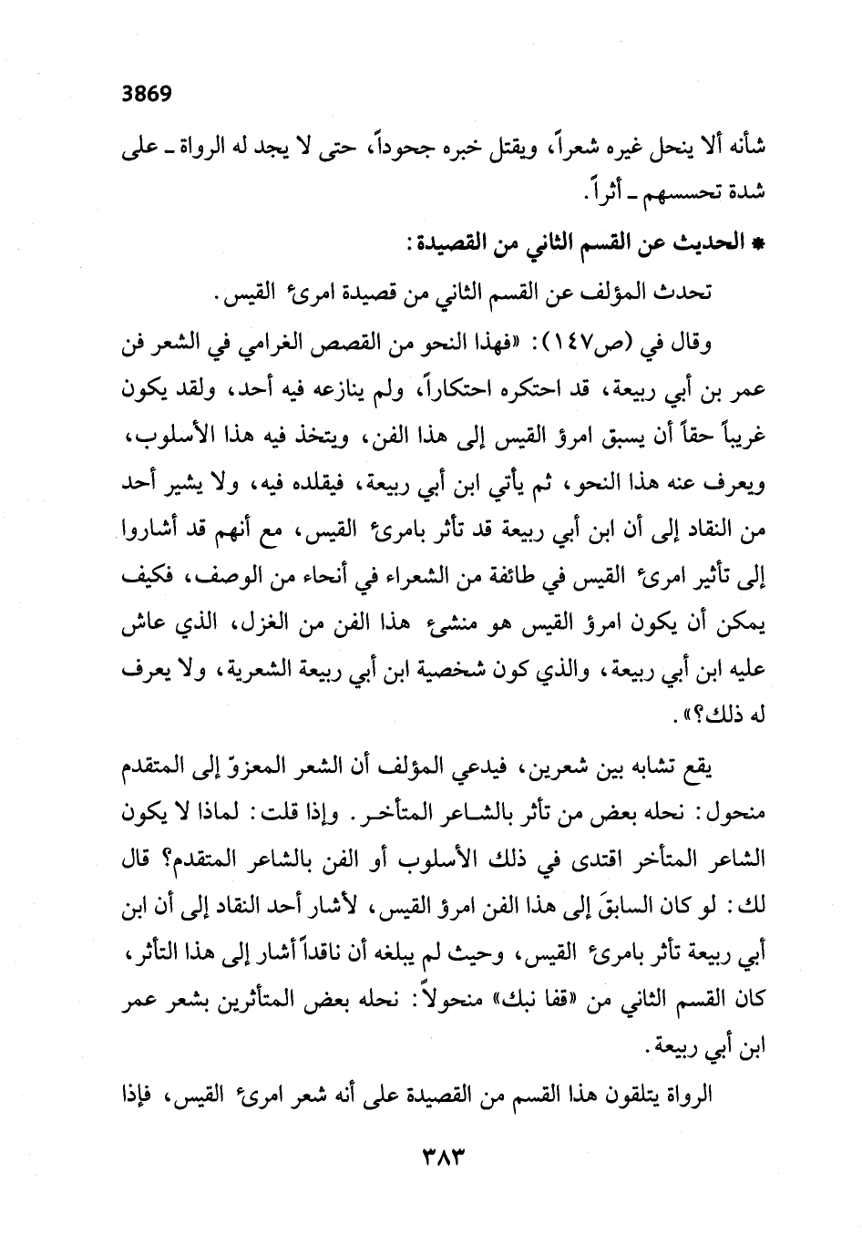 وقال في (ص 147): "فهذا النحو من القصص الغرامي في الشعر فن عمر بن أبي ربيعة، قد احتكره احتكاراً، ولم ينازعه فيه أحد، ولقد يكون غريباً حقاً أن يسبق امرؤ القيس إلى هذا الفن، ويتخذ فيه هذا الأسلوب، ويعرف عنه هذا النحو، ثم يأتي ابن أبي ربيعة، فيقلده فيه، ولا يشير أحد من النقاد إلى أن ابن أبي ربيعة قد تاثر بامرئ القيس، مع أنهم قد أشاروا إلى تأثير امرئ القيس في طائفة من الشعراء في أنحاء من الوصف، فكيف يمكن أن يكون امرؤ القيس هو منشئ هذا الفن من الغزل، الذي عاش عليه ابن أبي ربيعة، والذي كون شخصية ابن أبي ربيعة الشعرية، ولا يعرف له ذلك؟ ".
