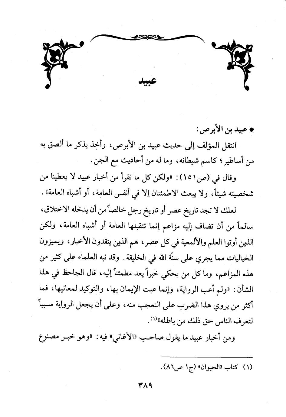انتقل المؤلف إلى حديث عبيد بن الأبرص، وأخذ يذكر ما ألصق به من أساطير؛ كاسم شيطانه، وما له من أحاديث مع الجن.