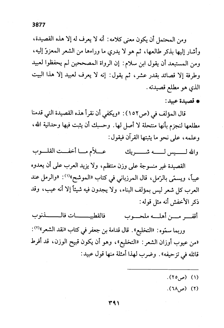 ومن المحتمل أن يكون معنى كلامه: أنه لا يعرف له إلا هذه القصيدة، وأشار إليها بذكر طالعها، ثم هو لا يدري ما وراءها من الشعر المعزوّ إليه، ومن المستبعد أن يقول ابن سلام: إن الرواة المصححين لم يحفظوا لعبيد وطرفة إلا قصائد بقدر عشر، ثم يقول: إنه لا يعرف لعبيد إلا هذا البيت الذي هو مطلع قصيدته.
