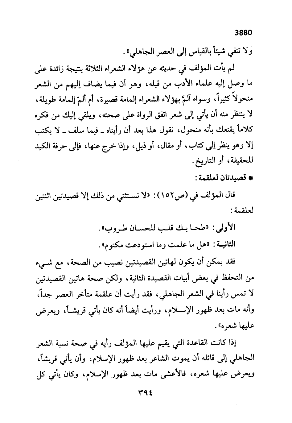 فقد يمكن أن يكون لهاتين القصيدتين نصيب من الصحة، مع شيء من التحفظ في بعض أبيات القصيدة الثانية، ولكن صحة هاتين القصيدتين لا تمس رأينا في الشعر الجاهلي، فقد رأيت أن علقمة متأخر العصر جداً، وأنه مات بعد ظهور الإسلام، ورأيت أيضاً أنه كان يأتي قريشاً، ويعرض عليها شعره".