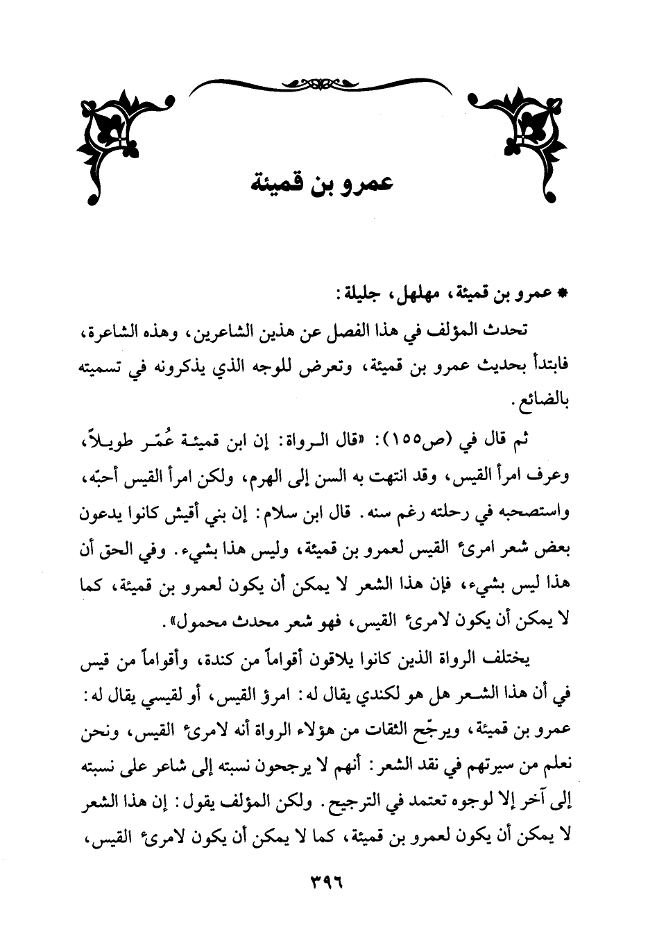 تحدث المؤلف في هذا الفصل عن هذين الشاعرين، وهذه الشاعرة، فابتدأ بحديث عمرو بن قميئة، وتعرض للوجه الذي يذكرونه في تسميته بالضائع.