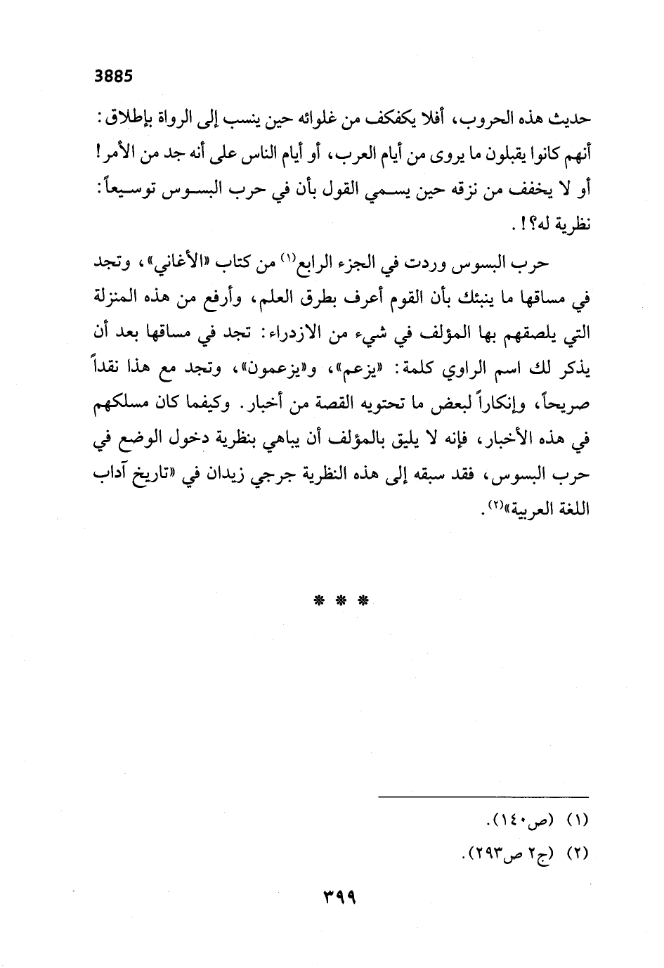 حرب البسوس وردت في الجزء الرابع (¬1) من كتاب "الأغاني"، وتجد في مساقها ما ينبئك بأن القوم أعرف بطرق العلم، وأرفع من هذه المنزلة التي يلصقهم بها المؤلف في شيء من الازدراء: تجد في مساقها بعد أن يذكر لك اسم الراوي كلمة: "يزعم"، و"يزعمون"، وتجد مع هذا نقداً صريحاً، وإنكاراً لبعض ما تحتويه القصة من أخبار. وكيفما كان مسلكهم في هذه الأخبار، فإنه لا يليق بالمؤلف أن يباهي بنظرية دخول الوضع في حرب البسوس، فقد سبقه إلى هذه النظرية جرجي زيدان في "تاريخ آداب اللغة العربية" (¬2).