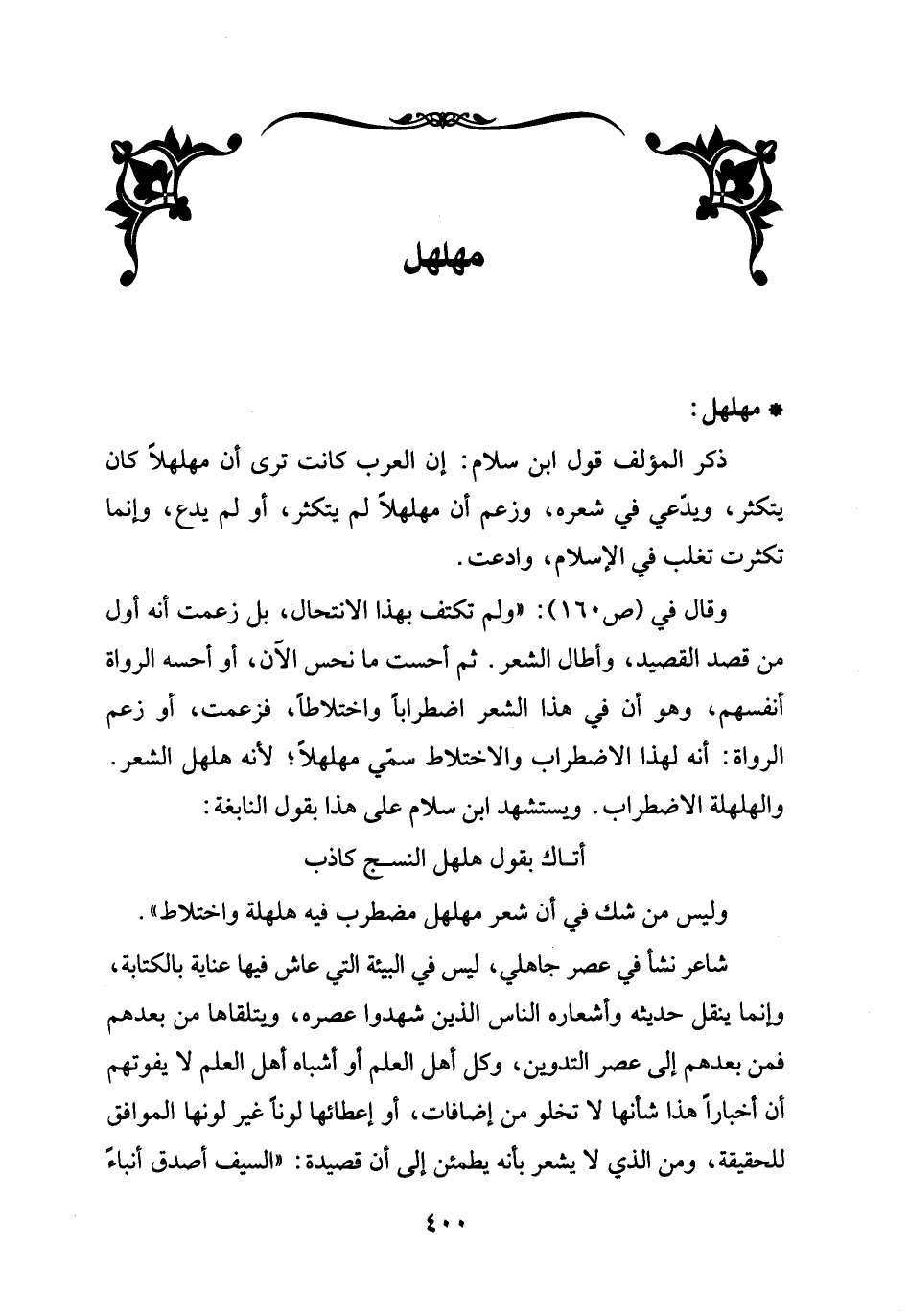 وقال في (ص 160): "ولم تكتف بهذا الانتحال، بل زعمت أنه أول من قصد القصيد، وأطال الشعر. ثم أحست ما نحس الآن، أو أحسه الرواة أنفسهم، وهو أن في هذا الشعر اضطراباً واختلاطاً، فزعمت، أو زعم الرواة: أنه لهذا الاضطراب والاختلاط سمّي مهلهلاً؛ لأنه هلهل الشعر. والهلهلة الاضطراب. ويستشهد ابن سلام على هذا بقول النابغة: