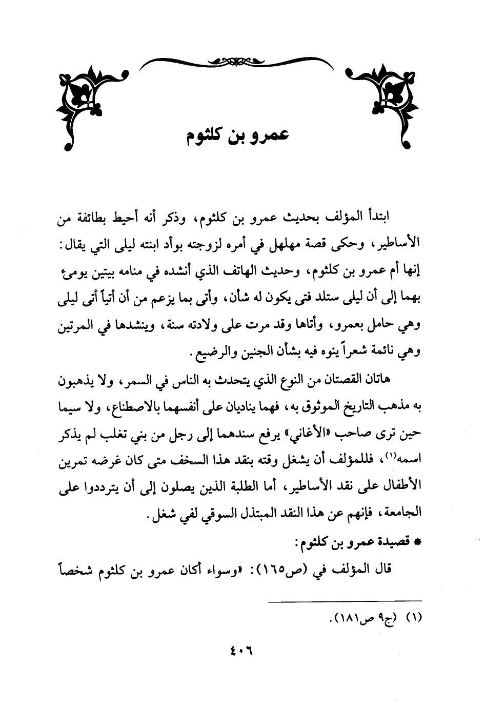 هاتان القصتان من النوع الذي يتحدث به الناس في السمر، ولا يذهبون به مذهب التاريخ الموثوق به، فهما يناديان على أنفسهما بالاصطناع، ولا سيما حين ترى صاحب "الأغاني" يرفع سندهما إلى رجل من بني تغلب لم يذكر اسمه (¬1)، فللمؤلف أن يشغل وقته بنقد هذا السخف متى كان غرضه تمرين الأطفال على نقد الأساطير، أما الطلبة الذين يصلون إلى أن يترددوا على الجامعة، فإنهم عن هذا النقد المبتذل السوقي لفي شغل.