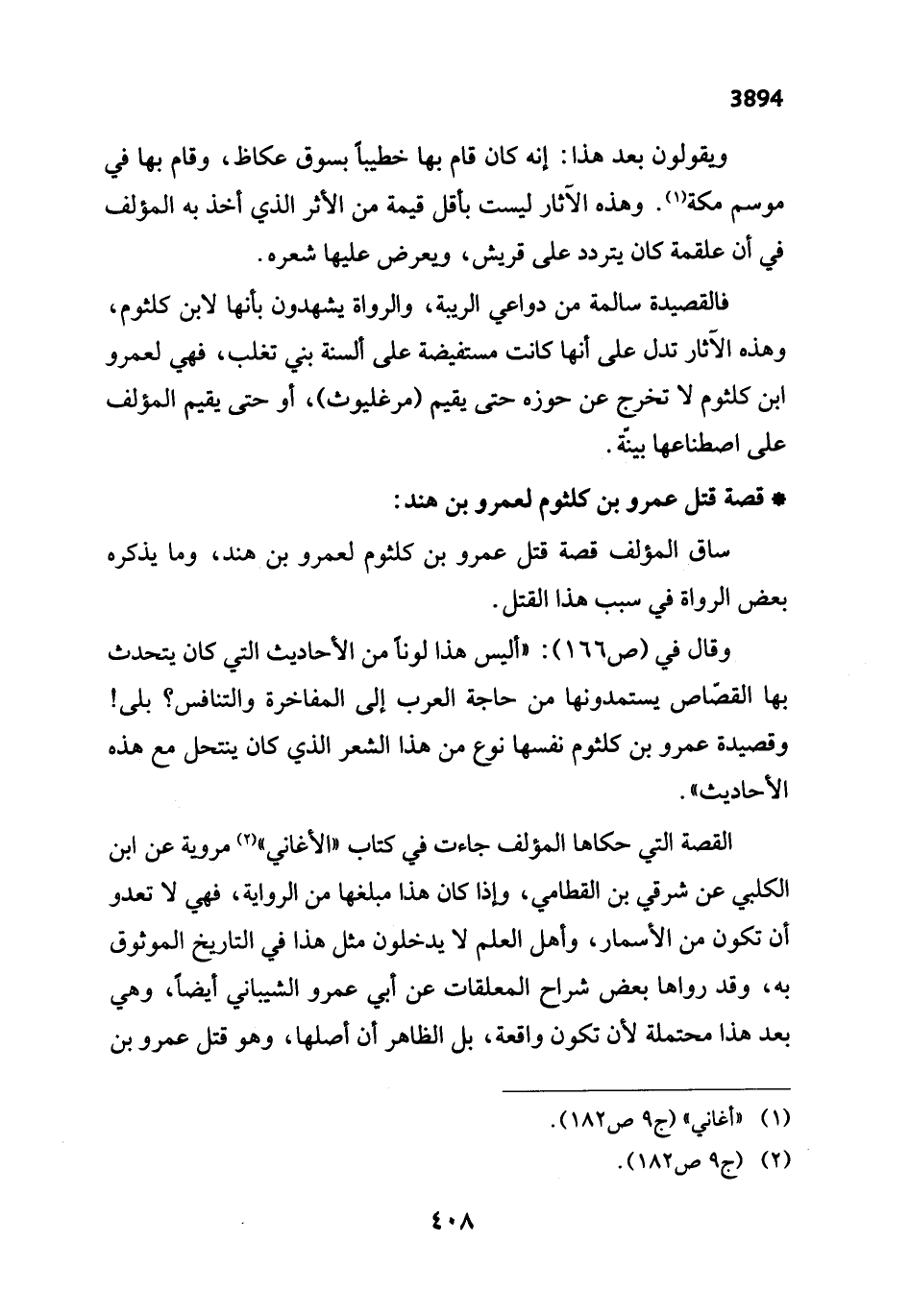 وقال في (ص 166): "أليس هذا لوناً من الأحاديث التي كان يتحدث بها القصّاص يستمدونها من حاجة العرب إلى المفاخرة والتنافس؟ بلى! وقصيدة عمرو بن كلثوم نفسها نوع من هذا الشعر الذي كان ينتحل مع هذه الأحاديث".