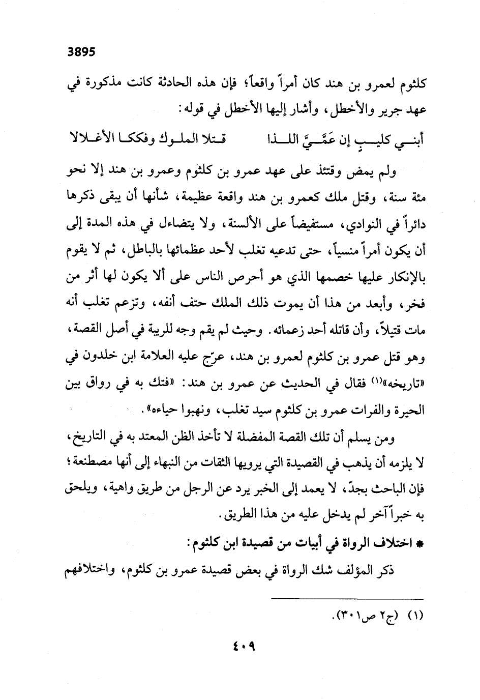 ولم يمض وقتئذ على عهد عمرو بن كلثوم وعمرو بن هند إلا نحو مئة سنة، وقتل ملك كعمرو بن هند واقعة عظيمة، شأنها أن يبقى ذكرها دائراً في النوادي، مستفيضاً على الألسنة، ولا يتضاءل في هذه المدة إلى أن يكون أمراً منسياً، حتى تدعيه تغلب لأحد عظمائها بالباطل، ثم لا يقوم بالإنكار عليها خصمها الذي هو أحرص الناس على ألا يكون لها أثر من فخر، وأبعد من هذا أن يموت ذلك الملك حتف أنفه، وتزعم تغلب أنه مات قتيلاً، وأن قاتله أحد زعمائه. وحيث لم يقم وجه للريبة في أصل القصة، وهو قتل عمرو بن كلثوم لعمرو بن هند، عرّج عليه العلامة ابن خلدون في "تاريخه" (¬1) فقال في الحديث عن عمرو بن هند: "فتك به في رواق بين الحيرة والفرات عمرو بن كلثوم سيد تغلب، ونهبوا حياءه".