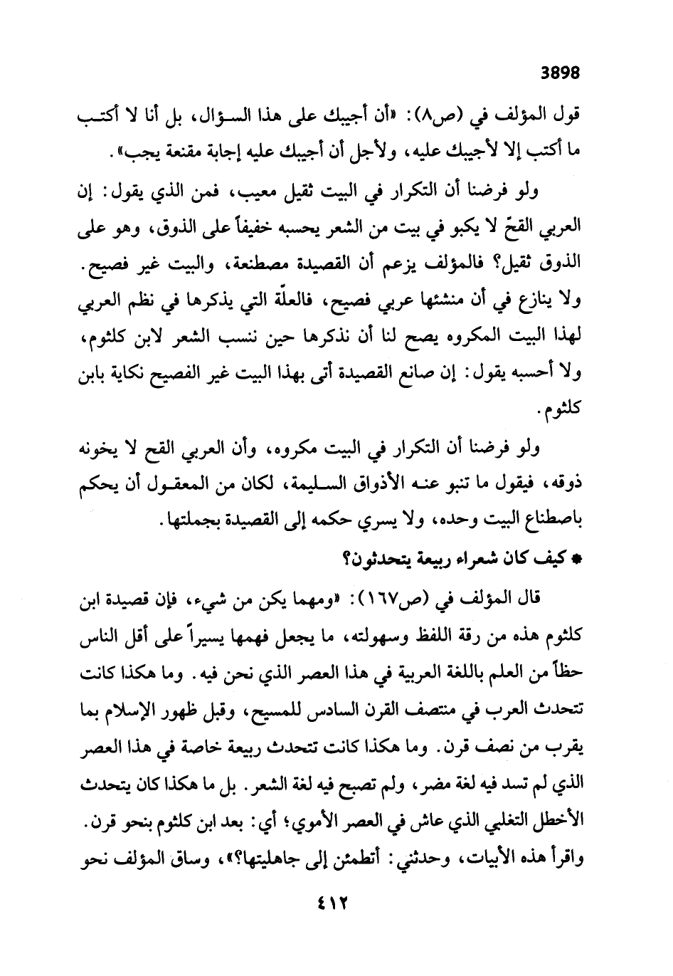 ولو فرضنا أن التكرار في البيت ثقيل معيب، فمن الذي يقول: إن العربي القحّ لا يكبو في بيت من الشعر يحسبه خفيفاً على الذوق، وهو على الذوق ثقيل؟ فالمؤلف يزعم أن القصيدة مصطنعة، والبيت غير فصيح. ولا ينازع في أن منشئها عربي فصيح، فالعلّة التي يذكرها في نظم العربي لهذا البيت المكروه يصح لنا أن نذكرها حين ننسب الشعر لابن كلثوم، ولا أحسبه يقول: إن صانع القصيدة أتى بهذا البيت غير الفصيح نكاية بابن كلثوم.