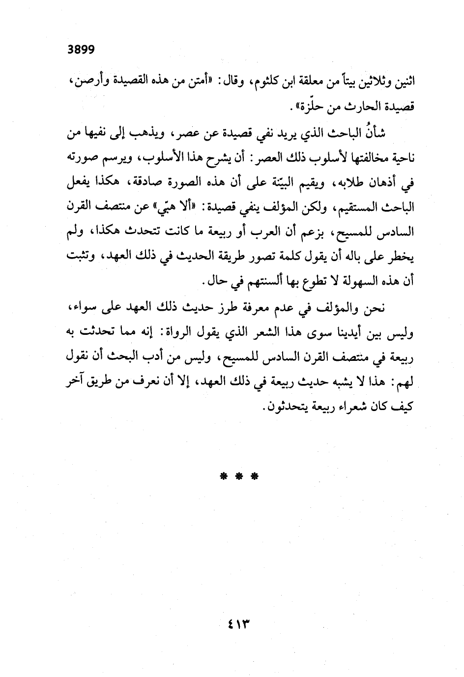 شأنُ الباحث الذي يريد نفي قصيدة عن عصر، ويذهب إلى نفيها من ناحية مخالفتها لأسلوب ذلك العصر: أن يشرح هذا الأسلوب، ويرسم صورته في أذهان طلابه، ويقيم البيّنة على أن هذه الصورة صادقة، هكذا يفعل الباحث المستقيم، ولكن المؤلف ينفي قصيدة: "ألا هبّي" عن منتصف القرن السادس للمسيح، بزعم أن العرب أو ربيعة ما كانت تتحدث هكذا، ولم يخطر على باله أن يقول كلمة تصور طريقة الحديث في ذلك العهد، وتثبت أن هذه السهولة لا تطوع بها ألسنتهم في حال.