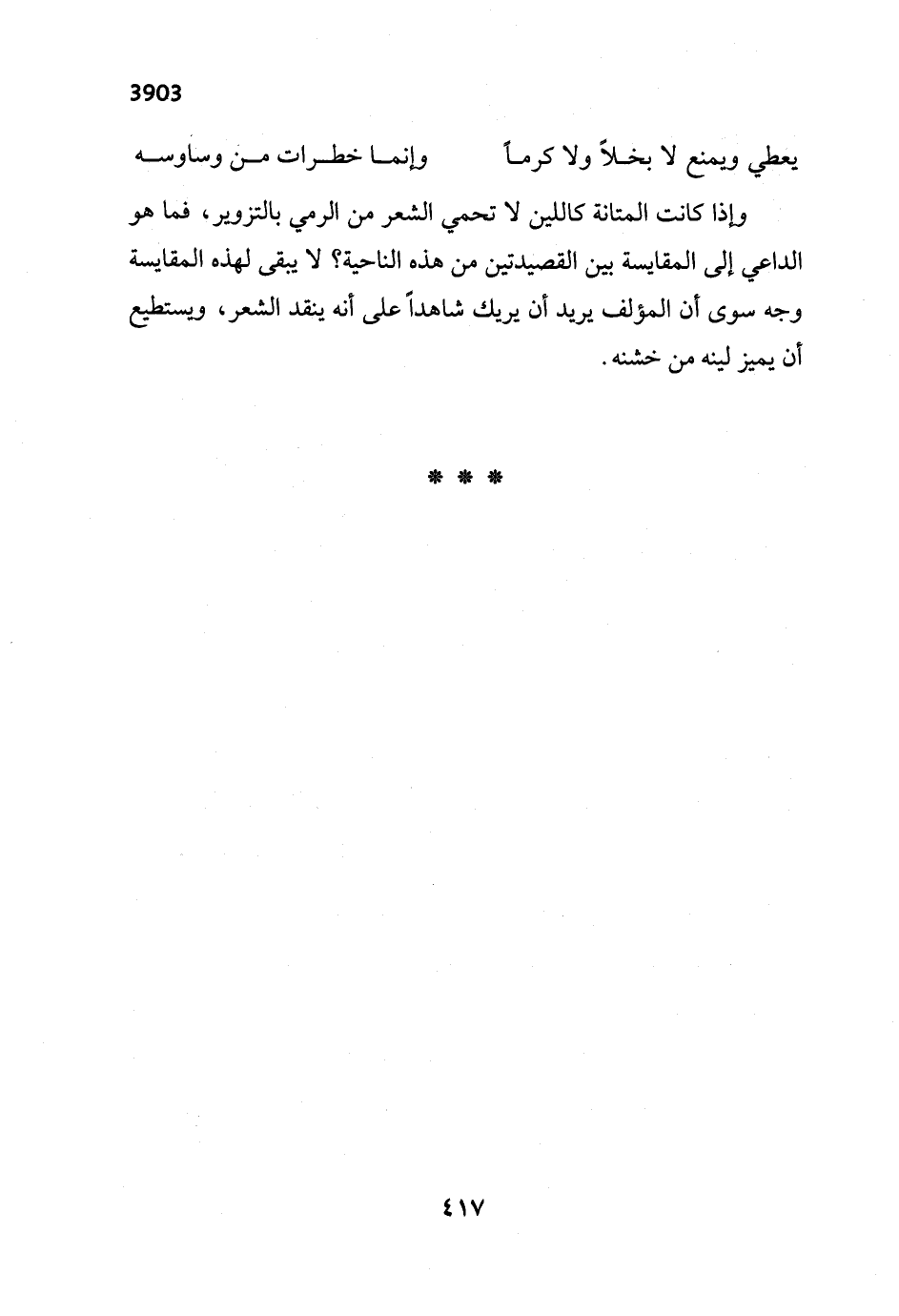 وإذا كانت المتانة كاللين لا تحمي الشعر من الرمي بالتزوير، فما هو الداعي إلى المقايسة بين القصيدتين من هذه الناحية؟ لا يبقى لهذه المقايسة وجه سوى أن المؤلف يريد أن يريك شاهداً على أنه ينقد الشعر، ويستطيع أن يميز لينه من خشنه.