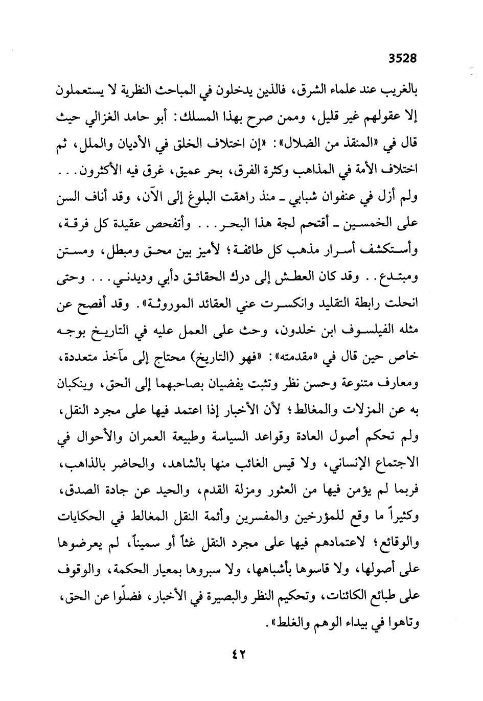 بالغريب عند علماء الشرق، فالذين يدخلون في المباحث النظرية لا يستعملون إلا عقولهم غير قليل، وممن صرح بهذا المسلك: أبو حامد الغزالي حيث قال في "المنقذ من الضلال": "إن اختلاف الخلق في الأديان والملل، ثم اختلاف الأمة في المذاهب وكثرة الفرق، بحر عميق، غرق فيه الأكثرون ... ولم أزل في عنفوان شبابي - منذ راهقت البلوغ إلى الآن، وقد أناف السن على الخمسين - أقتحم لجة هذا البحر ... وأتفحص عقيدة كل فرقة، وأستكشف أسرار مذهب كل طائفة؛ لأميز بين محق ومبطل، ومستن ومبتدع .. وقد كان العطش إلى درك الحقائق دأبي وديدني ... وحتى انحلت رابطة التقليد وانكسرت عني العقائد الموروثة". وقد أفصح عن مثله الفيلسوف ابن خلدون، وحث على العمل عليه في التاريخ بوجه خاص حين قال في "مقدمته": "فهو (التاريخ) محتاج إلى مآخذ متعددة، ومعارف متنوعة وحسن نظر وتثبت يفضيان بصاحبهما إلى الحق، وينكبان به عن المزلات والمغالط؛ لأن الأخبار إذا اعتمد فيها على مجرد النقل، ولم تحكم أصول العادة وقواعد السياسة وطبيعة العمران والأحوال في الاجتماع الإنساني، ولا قيس الغائب منها بالشاهد، والحاضر بالذاهب، فربما لم يؤمن فيها من العثور ومزلة القدم، والحيد عن جادة الصدق، وكثيراً ما وقع للمؤرخين والمفسرين وأئمة النقل المغالط في الحكايات والوقائع؛ لاعتمادهم فيها على مجرد النقل غثاً أو سميناً، لم يعرضوها على أصولها، ولا قاسوها بأشباهها، ولا سبروها بمعيار الحكمة، والوقوف على طبائع الكائنات، وتحكيم النظر والبصيرة في الأخبار، فضلّوا عن الحق، وتاهوا في بيداء الوهم والغلط".