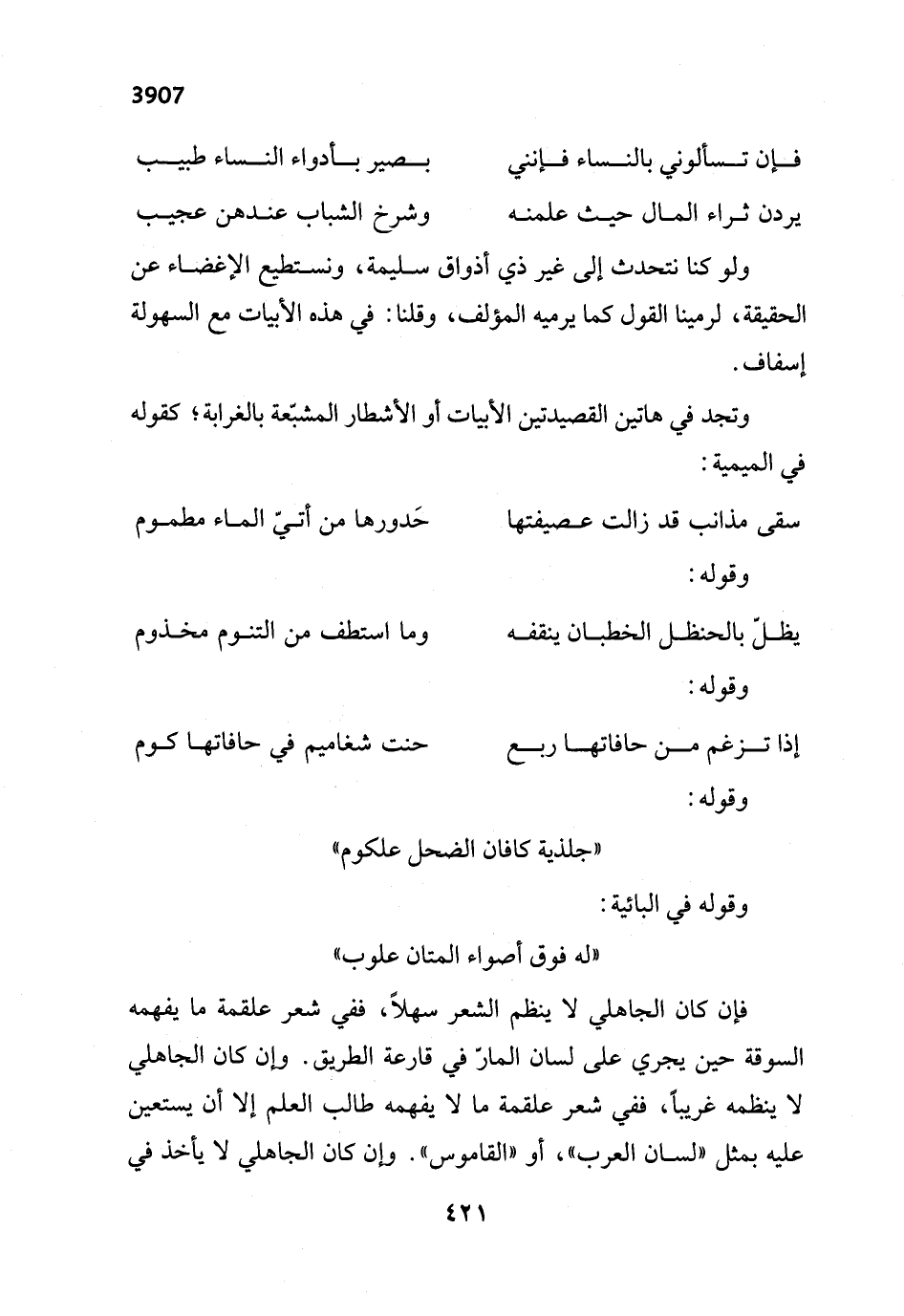 فإن كان الجاهلي لا ينظم الشعر سهلاً، ففي شعر علقمة ما يفهمه السوقة حين يجري على لسان المارّ في قارعة الطريق. وإن كان الجاهلي لا ينظمه غريباً، ففي شعر علقمة ما لا يفهمه طالب العلم إلا أن يستعين عليه بمثل "لسان العرب"، أو "القاموس". وإن كان الجاهلي لا يأخذ في