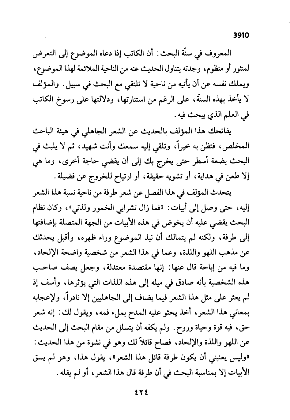 يفاتحك هذا المؤلف بالحديث عن الشعر الجاهلي في هيئة الباحث المخلص، فتظن به خيراً، وتلقي إليه سمعك وأنت شهيد، ثم لا يلبث في البحث بضعة أسطر حتى يخرج بك إلى أن يقضي حاجة أخرى، وما هي إلا طعن في هداية، أو تشويه حقيقة، أو ارتياح للخروج عن فضيلة.